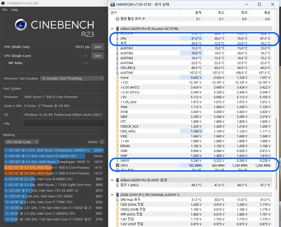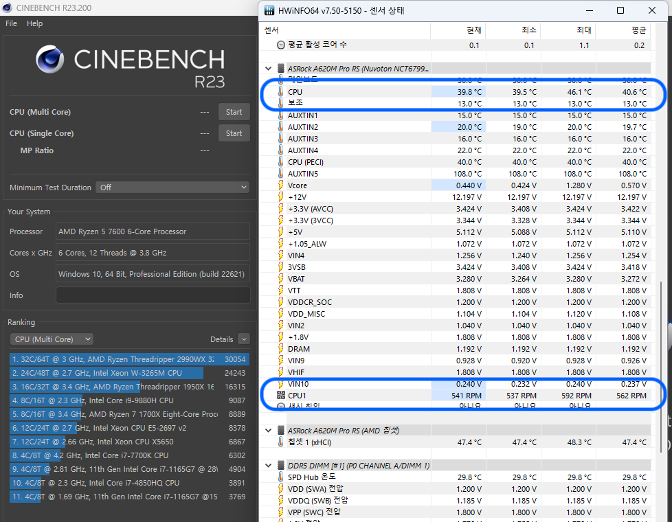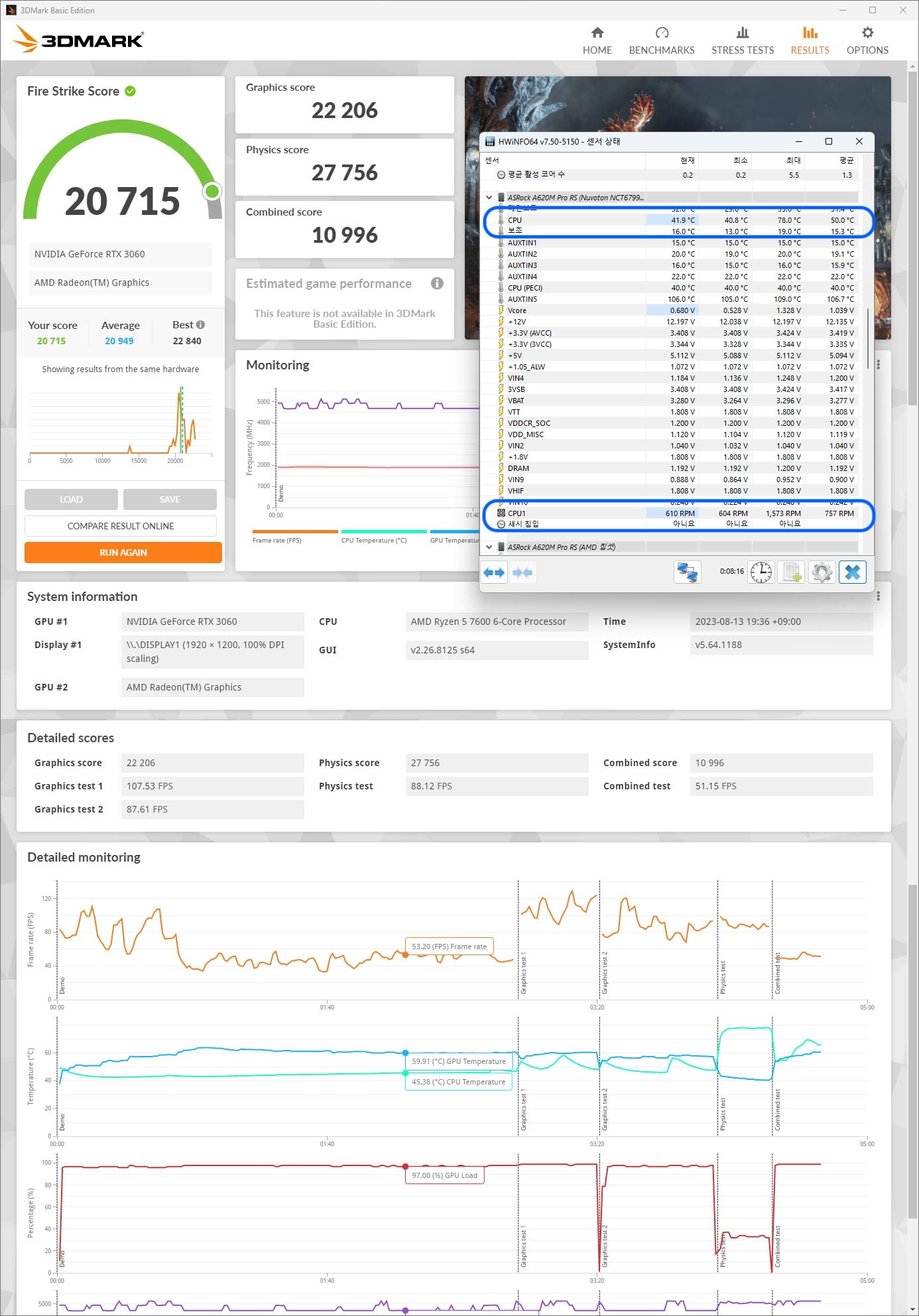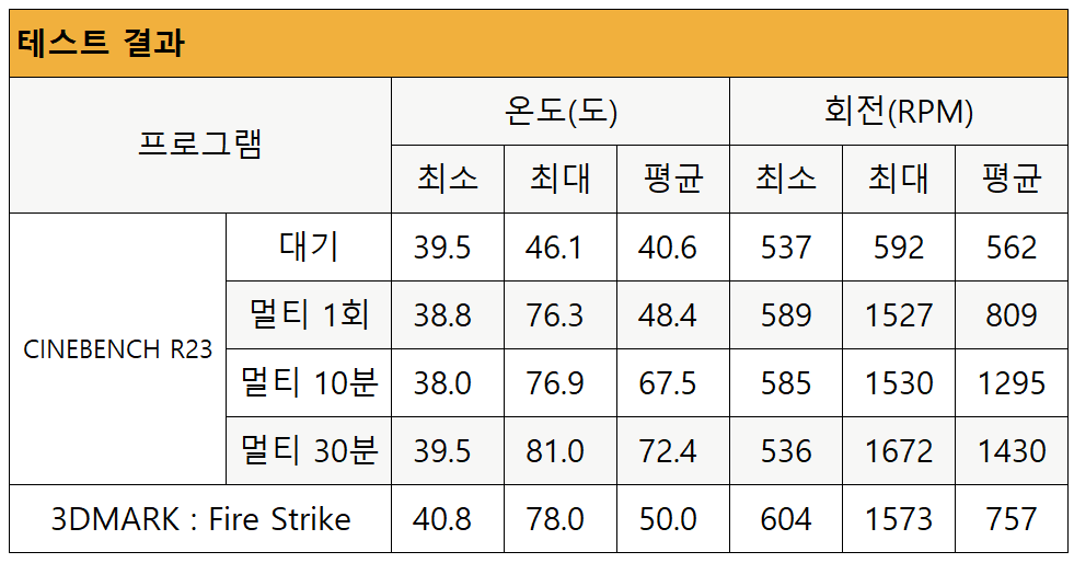 CINEBENCH R23 으로, CPU를 일정 시간 동안 최대 부하를 걸었을때, 온도와 쿨링팬의 회전 속도를 테스트를 진행했습니다. 그리고 게임 벤치마크로 많이 사용되는 3DMARK의 Fire Strike로 테스트를 진행했습니다.