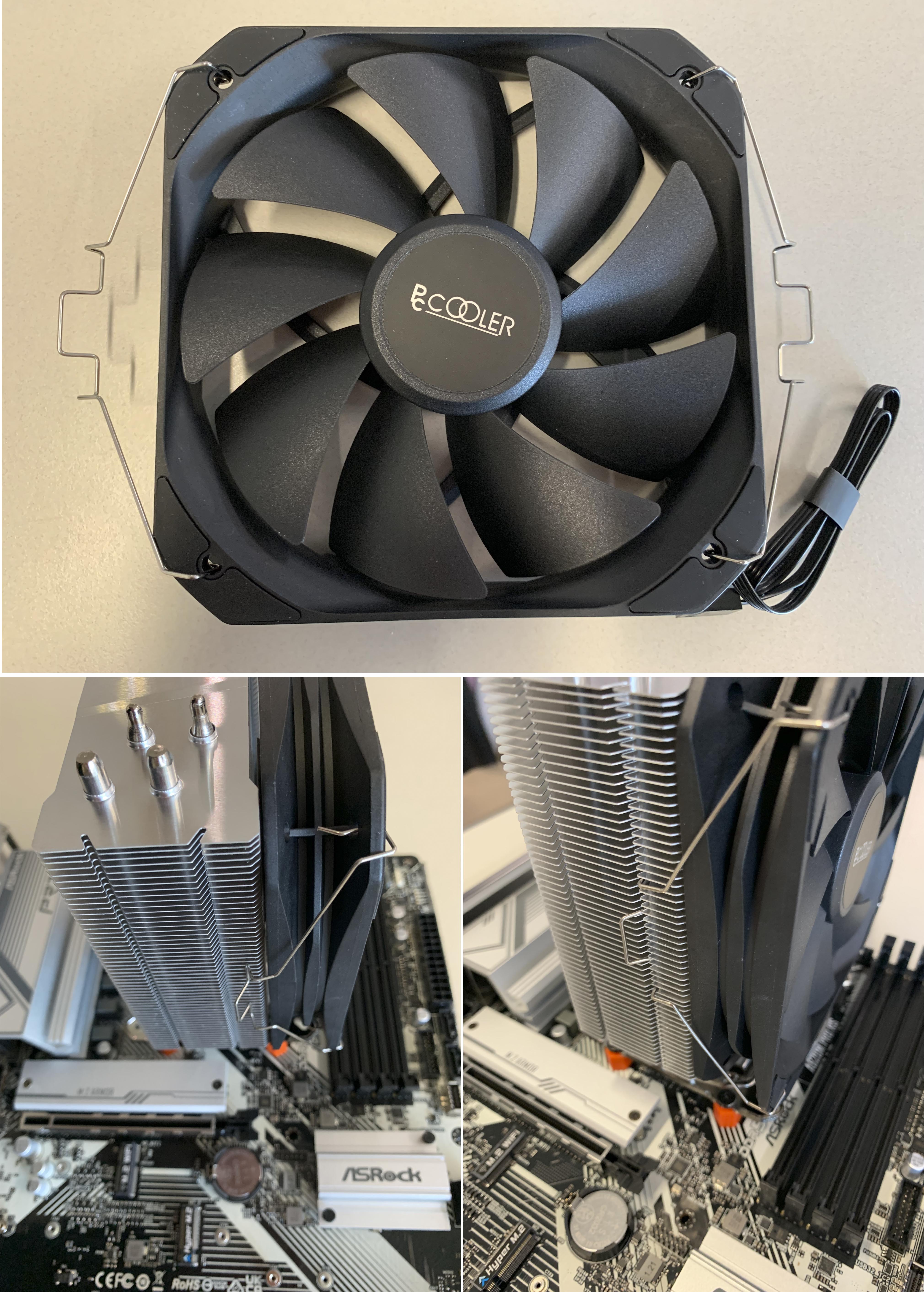 팬 클립을 쿨링팬에 먼저 연결한 다음, 사진과 같이 손가락으로 벌려 당기듯 힘주어 고정시킵니다.