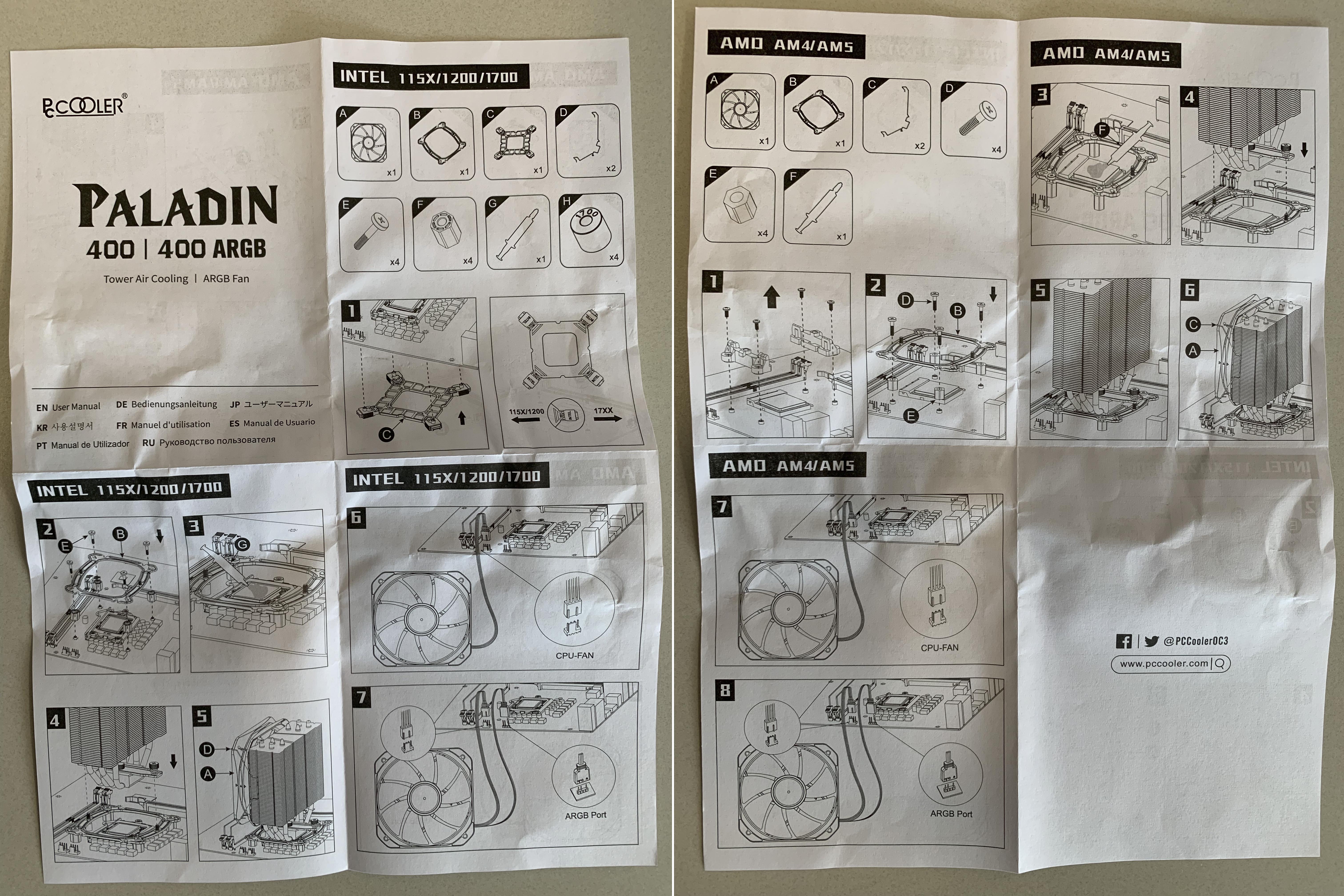 PcCOOLER 팔라딘 400 본체, 인텔/AMD 가이드, 써멀그리스, 고정나사로 구성되어 있습니다.