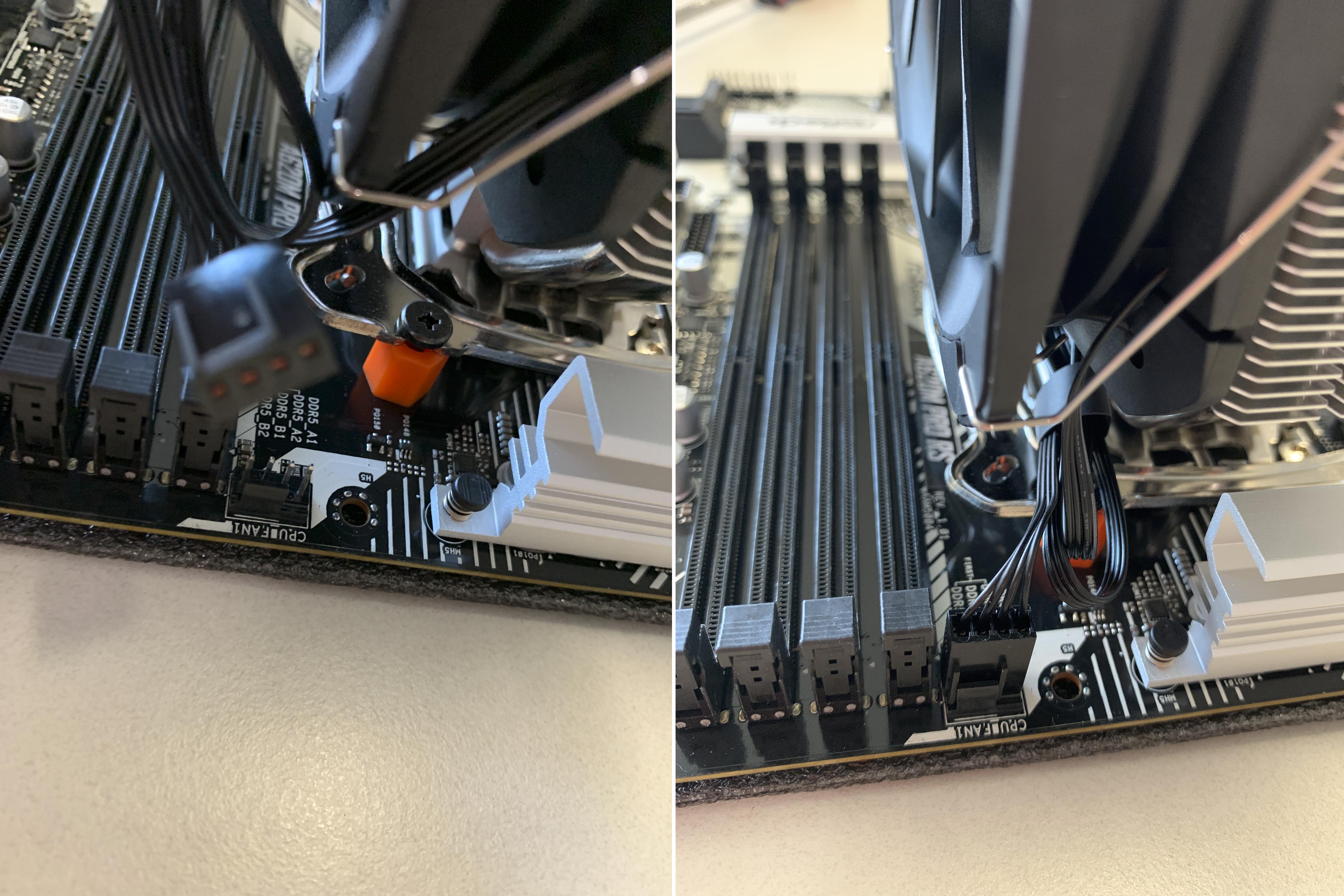 마지막으로 팬에 연결된 4핀을 메인보드의 CPU FAN에 연결하여 조립을 마무리 합니다.