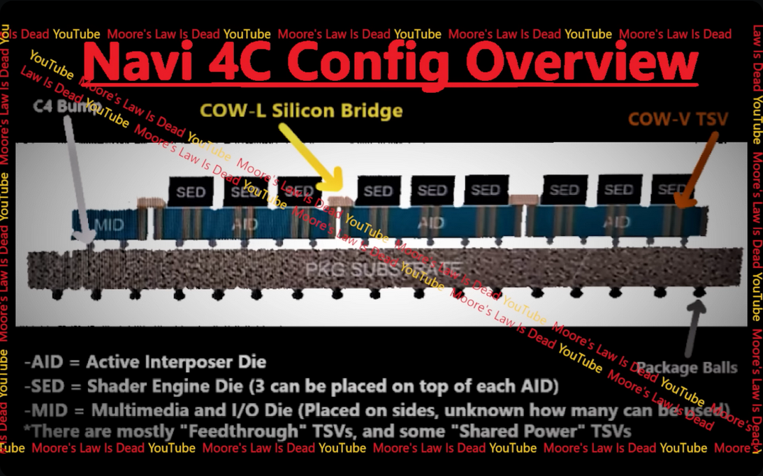 AMD Navi 4C(RDNA 4) GPU의 기본 레이어는 그 위에 여러 AID 및 MID를 고정하는 패키지 기판이었습니다. AID는 활성 인터포저 다이이며 기존 Navi 31 및 Navi 32 MCM GPU에 탑재된 MCD와 유사한 단일 MID 또는 멀티미디어 및 I/O 다이와 함께 제공되는 다이가 4개 있습니다. 이 칩렛에는 다른 멀티미디어 기능과 함께 VRAM 버스 컨트롤러 및 Infinity Cache가 포함되어 있습니다. 차세대 인터커넥트 패브릭을 사용하여 AID에 연결된 MID와 AID도 동일한 패브릭을 사용하여 상호 연결되었습니다.