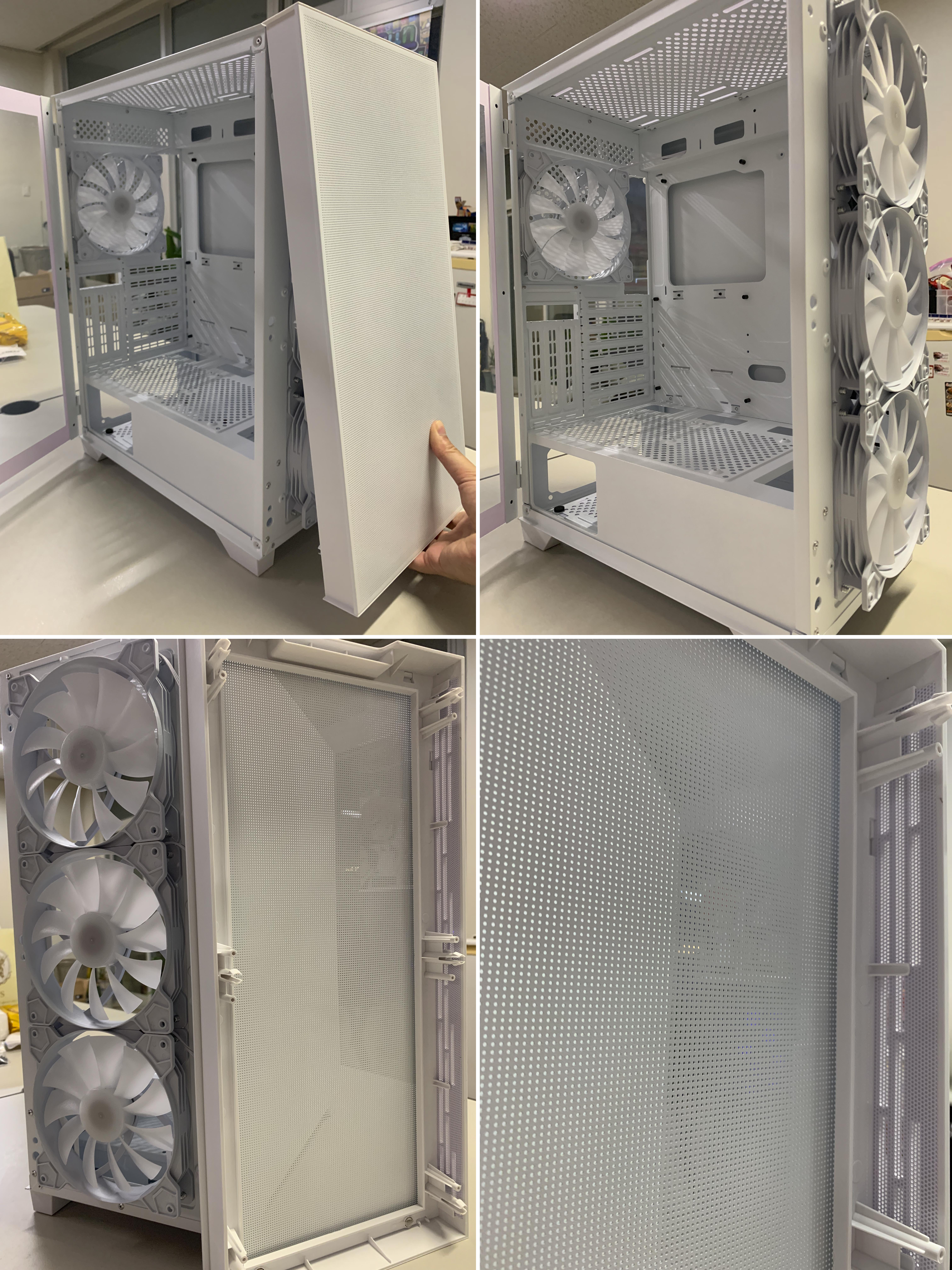 - 전면 메쉬구조와 140mm 4개의 팬 구성으로 쿨링효과를 극대화했으며, 스윙 도어 강화유리로 조립 분해 편의성은 물론 내부를 볼수 있어서 사용자의 취향대로 튜닝이 가능하도록 했습니다. 편리한 전면 분리구조로 되어 있어서, 공기 유입이 많은 전면 메쉬의 먼지를 쉽게 청소할수 있도록 했습니다.