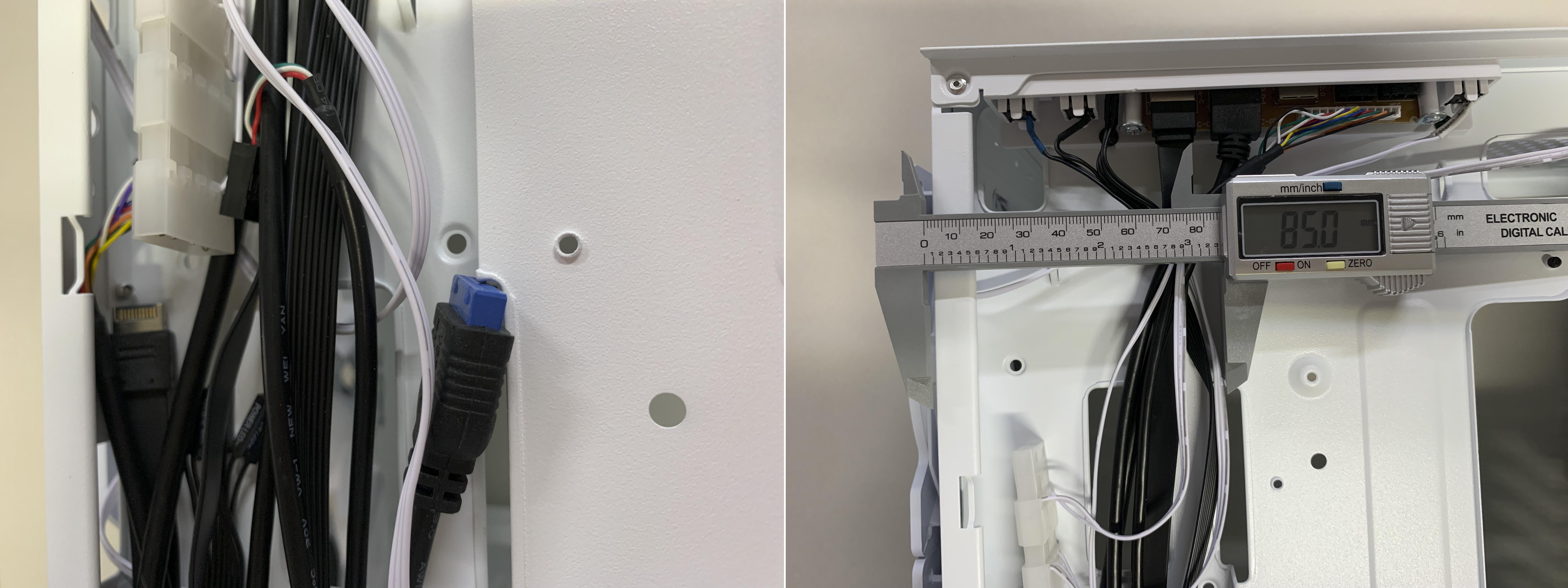 케이스 뒷면 좌측에는 가로 85mm, 22mm의 깊이의 케이블 관리 및 수납 공간이 있습니다.