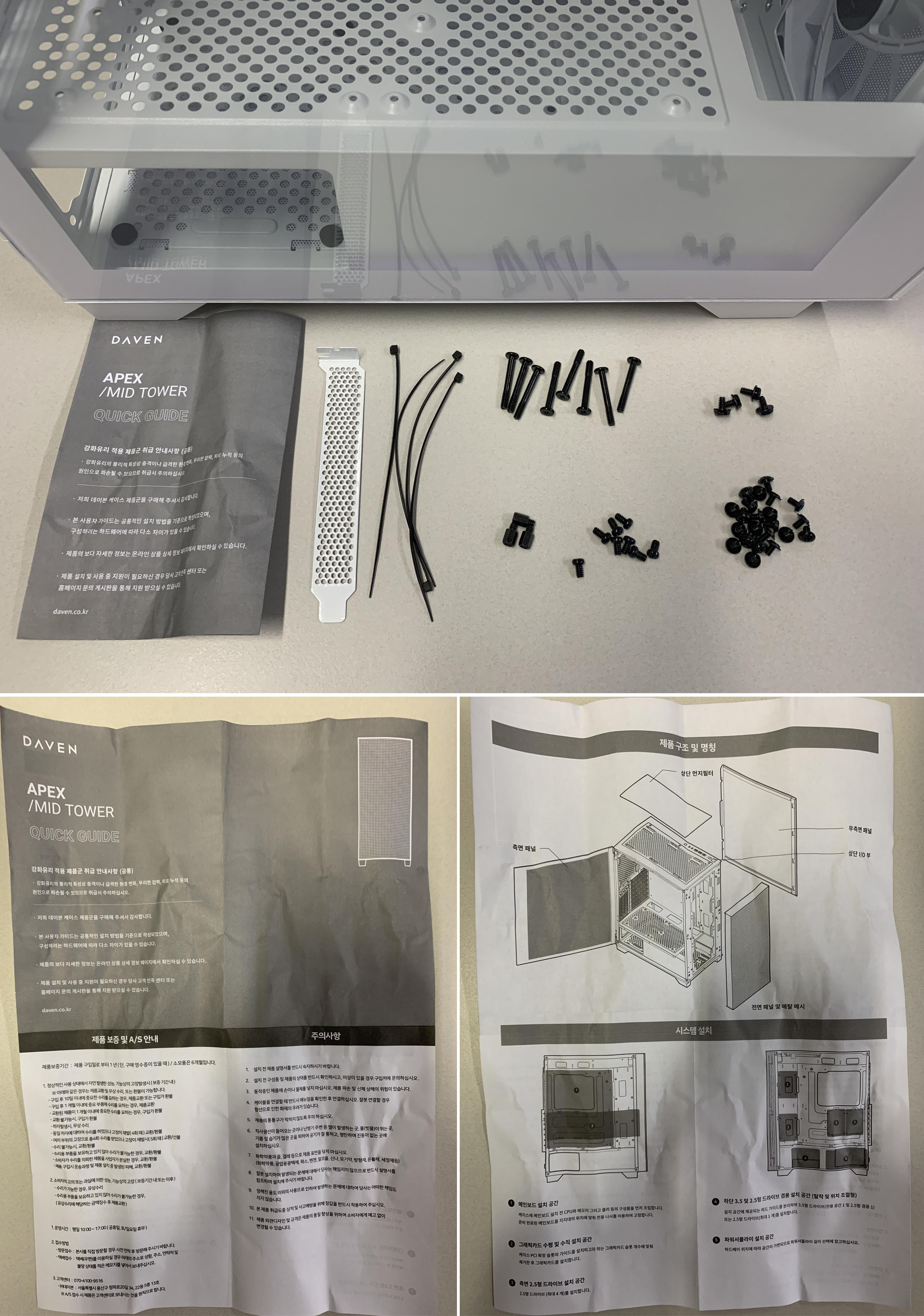 구성품은 가이드, 조립시 사용되는 커넥트 타이, 고정나사, PCI 슬롯 커버 등이 있습니다.