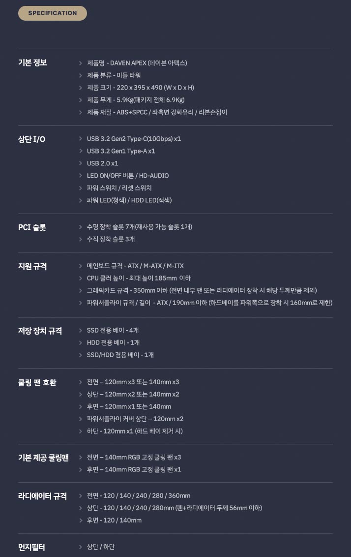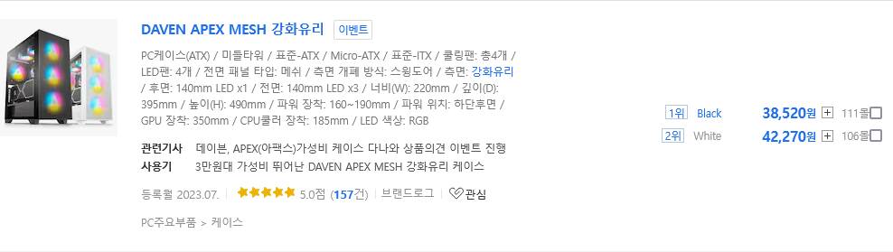- 블랙 : https://prod.danawa.com/info/?pcode=21625646&_OC_=ex_blog1&logger_kw=ex_blog1&?utm_source=naver&utm_medium=blog&utm_content=&utm_campaign=event_daven_230809#가성비케이스 #게이밍PC #추천PC케이스 #DAVEN #APEX