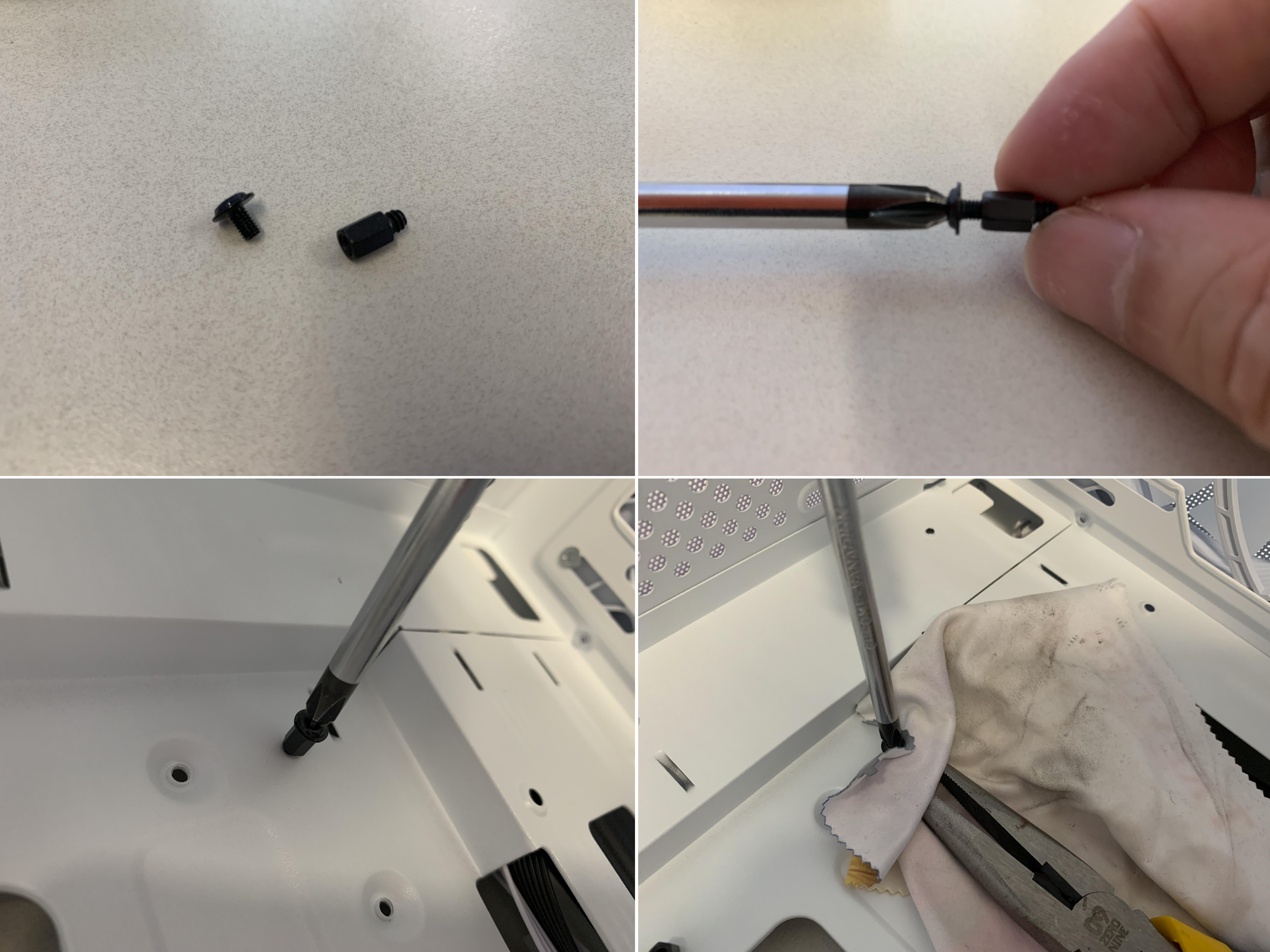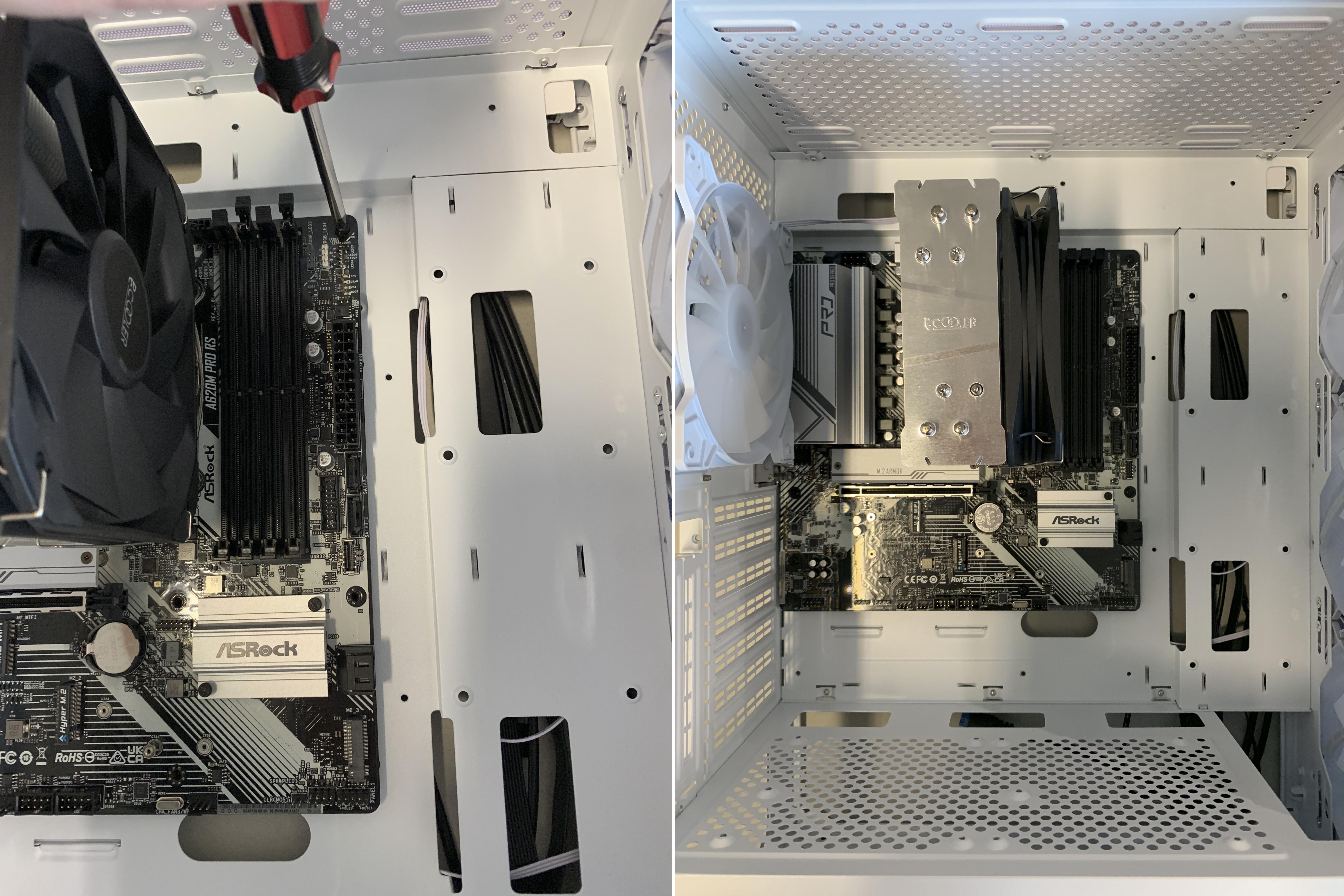 설치하는 메인보드는 mATX 제품이라, ATX기준으로 설치되는 2개의 나사기둥을 제거하고, 새 자리로 옮겨 설치했습니다. 추가로, 패키지에 포함된 나사기둥 2개를 설치했습니다.