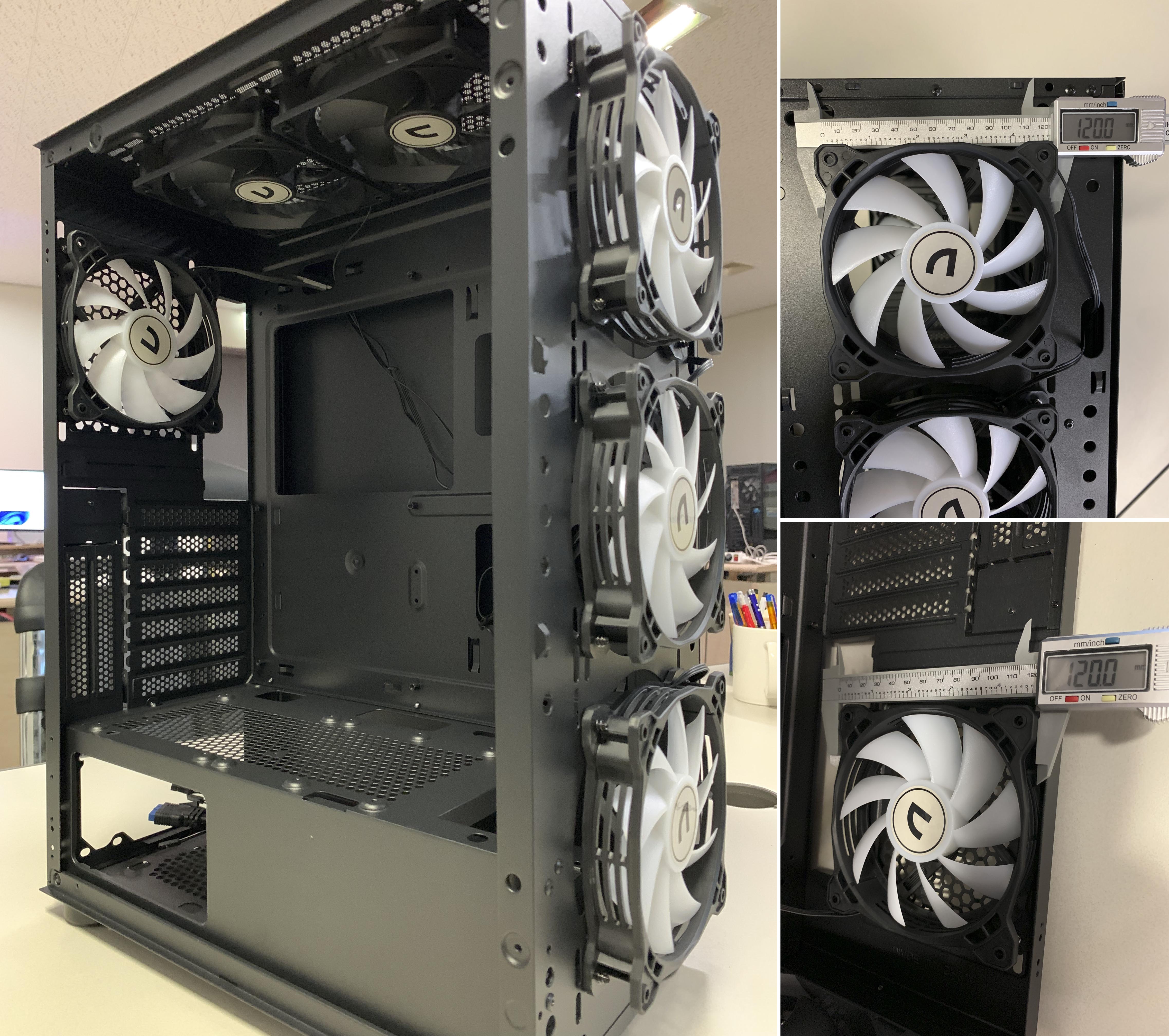 전면 3개와 후면 1개는 고정RGB, 상단 2개는 논RGB이며 동일하게 120mm 사이즈로 측정되었으며, 시원한 쿨링이 기대됩니다.