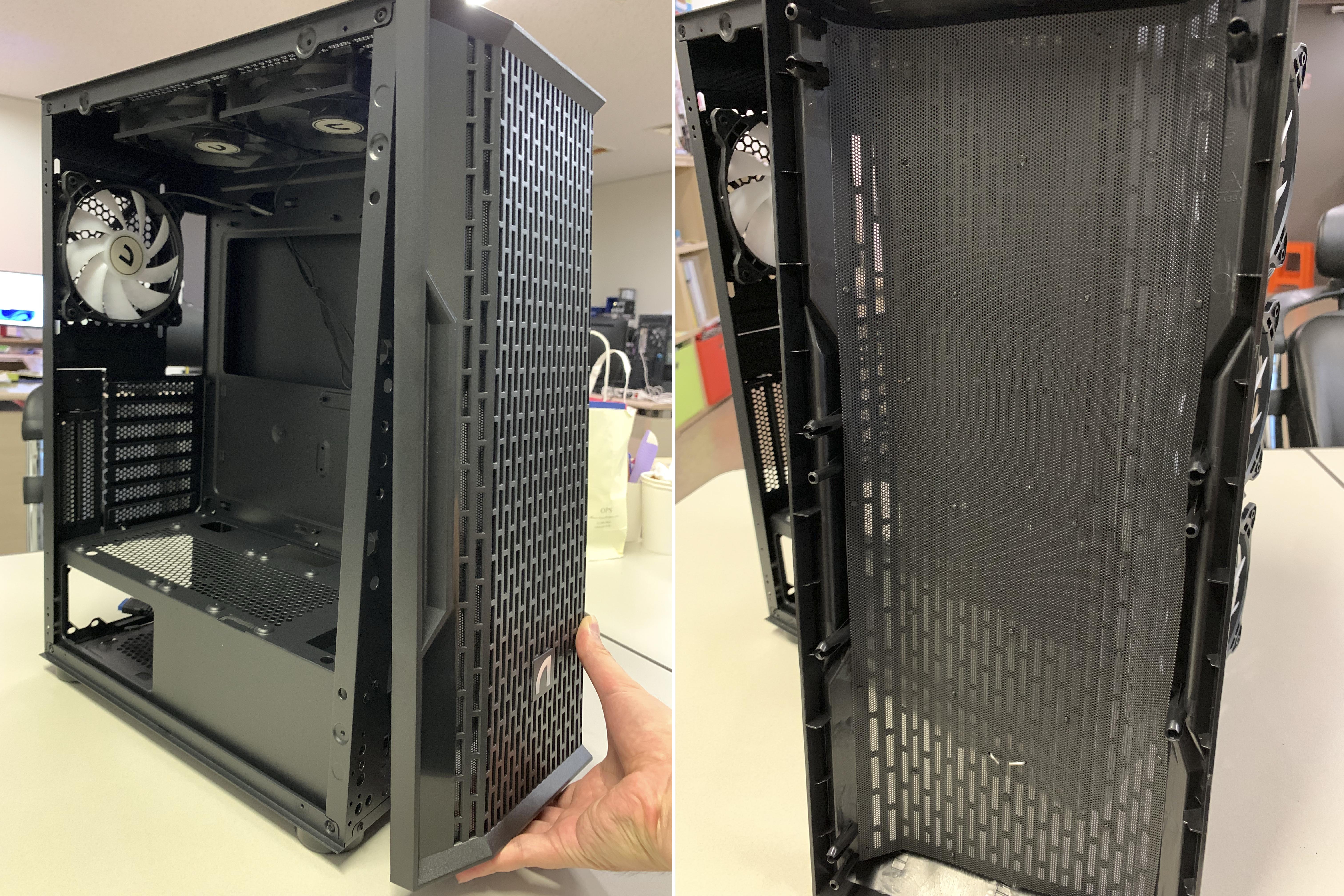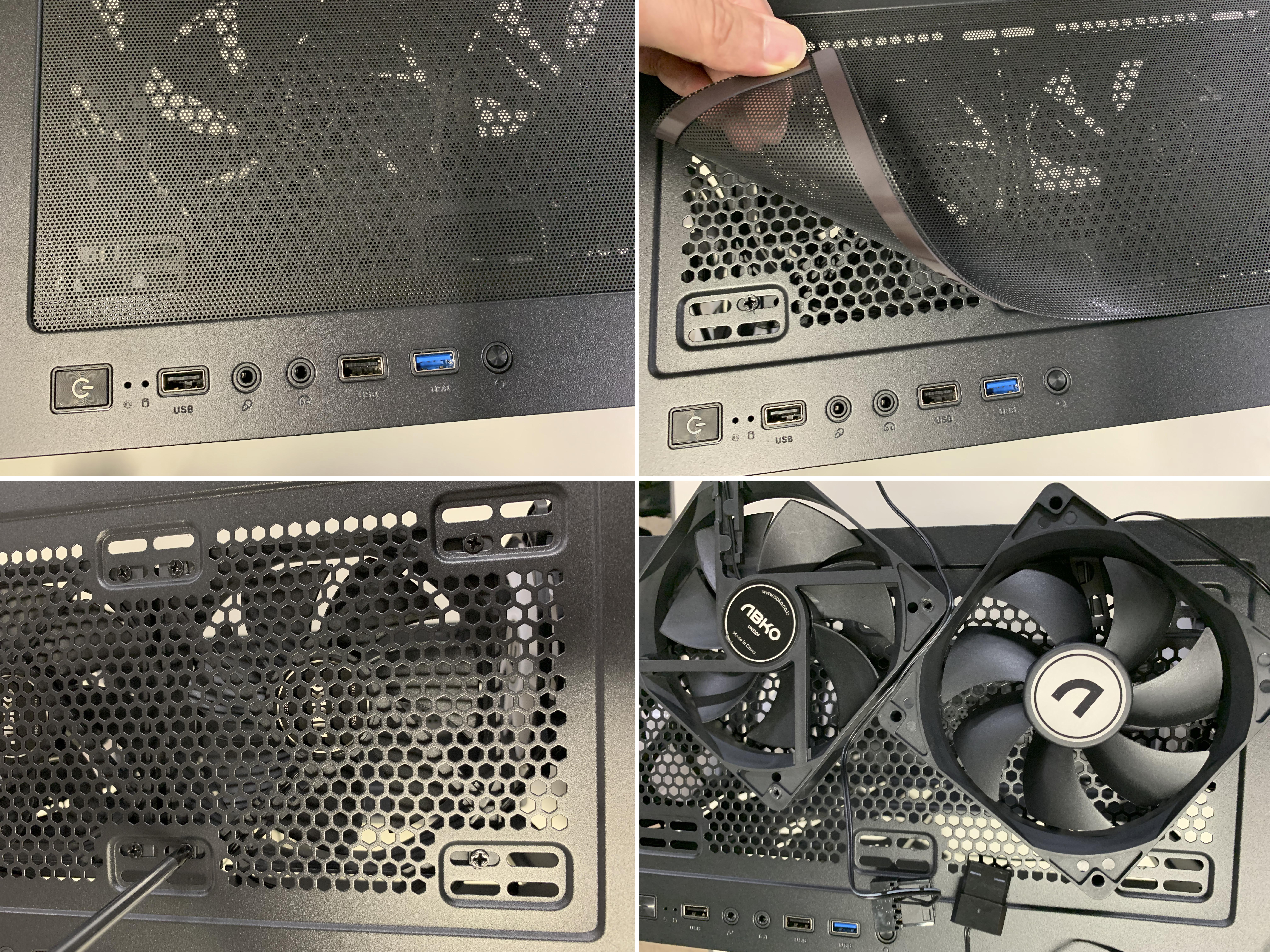 전면 메쉬 디자인으로 쿨링 성능이 기대되며, 먼지 유입 방지를 위해 먼지 필터가 장착되어 있습니다.
