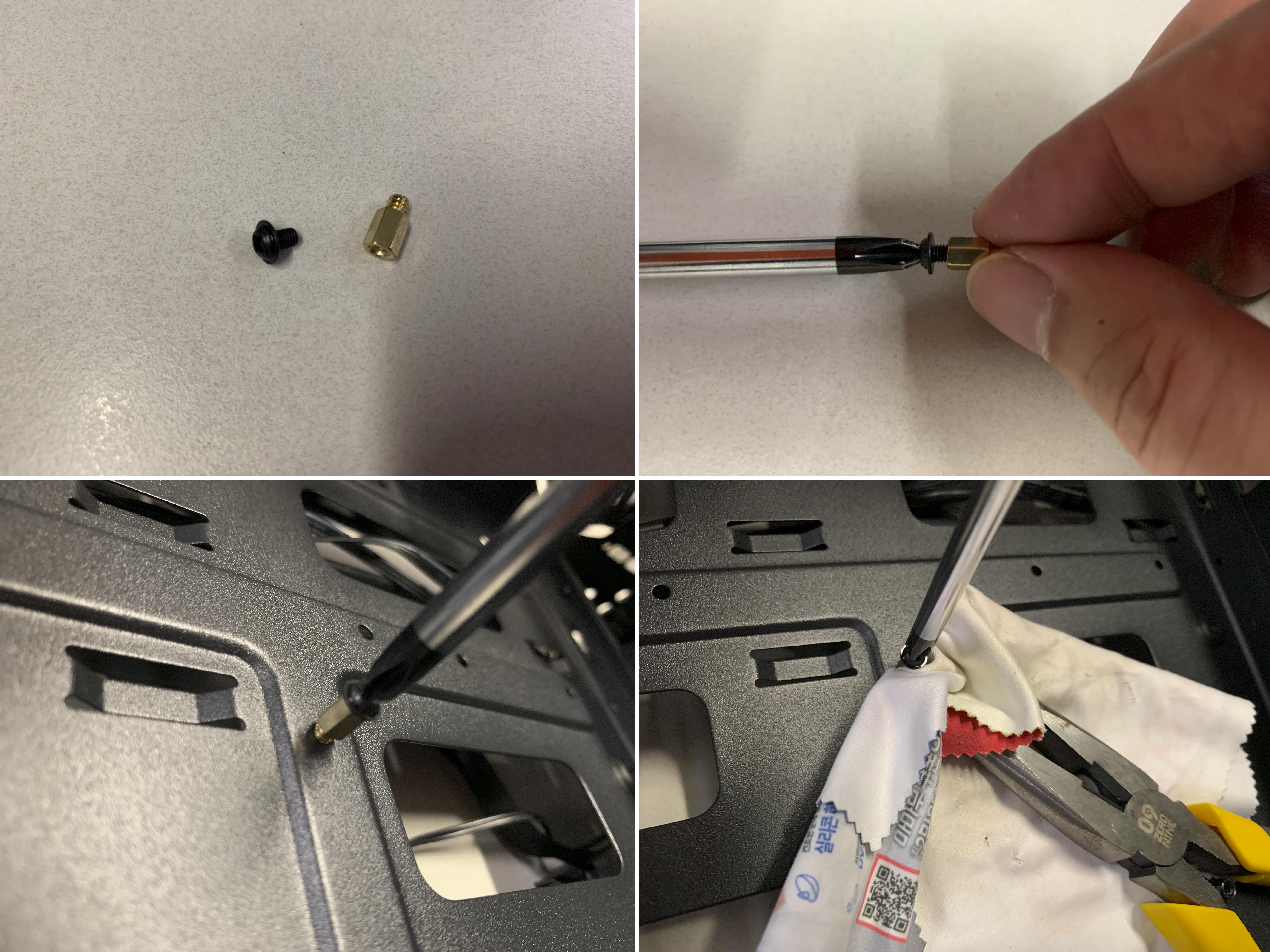설치하는 메인보드는 mATX 제품이라, ATX기준으로 설치되는 2개의 나사기둥을 제거하고, 새 자리로 옮겨 설치했습니다. 추가로, 패키지에 포함된 나사기둥 2개를 설치했습니다.