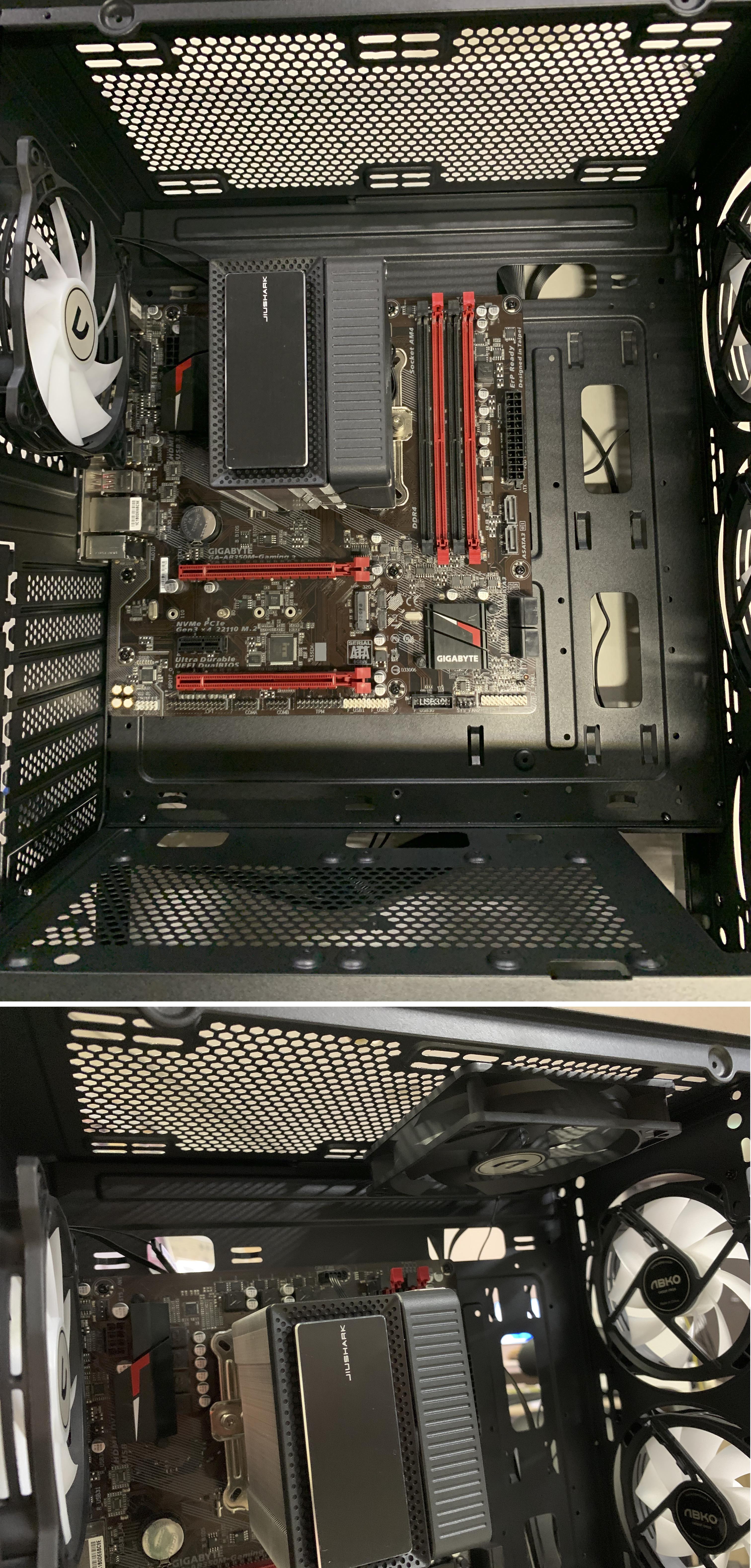 조립시 공간이 좁으면 불편을 것을 예상하고 상단 쿨링팬을 분리했었지만, 굳이 분리할 필요가 없을 만큼 공간이 넉넉합니다.