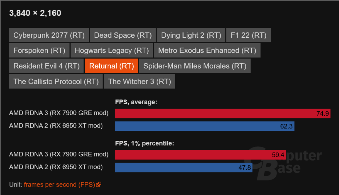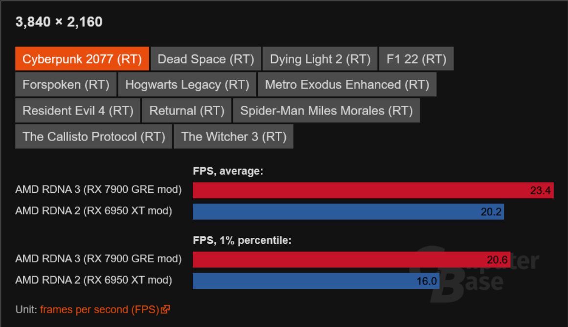 Returnal과 같은 특정 레이 트레이싱 타이틀은 RDNA 2와 RDNA 3 사이에서 최대 20% 의 적자를 나타냅니다. Cyberpunk 2077은 후자에서도 10% 이상 빠릅니다. 안타깝게도 대부분의 다른 결과는 울트라 광선 추적 사전 설정에서 10% 미만의 델타를 나타냅니다.