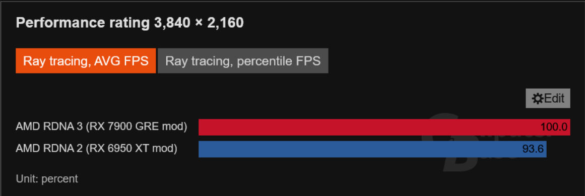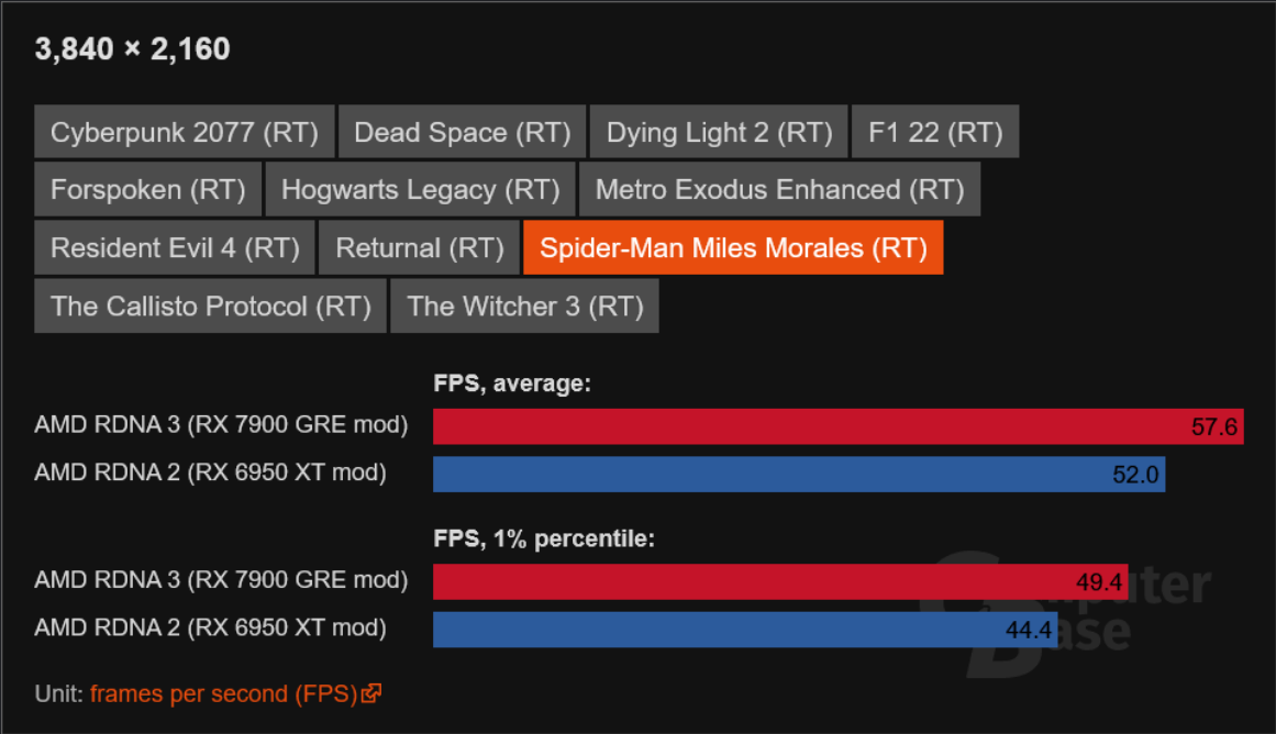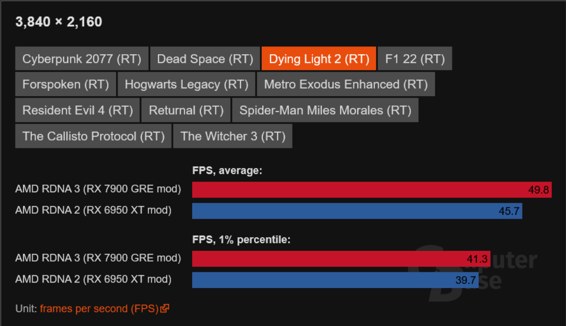 놀랍게도 레이 트레이싱 게임의 성능 차이는 그리 크지 않습니다. 평균적으로 Radeon RX 7900 GRE는 광선 추적이 켜진 상태에서 4K에서 RX 6950 XT보다 7% 더 빠릅니다 .