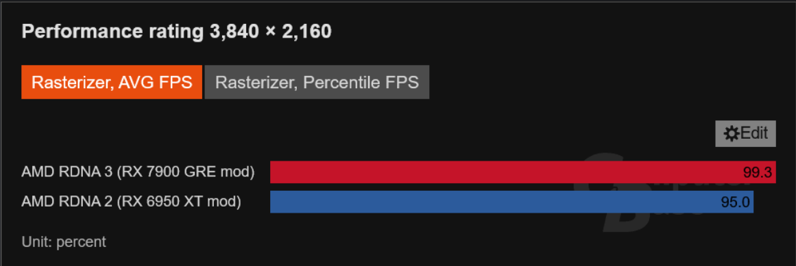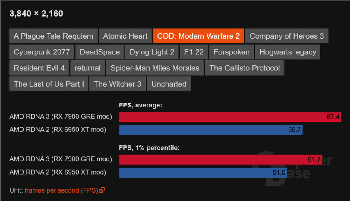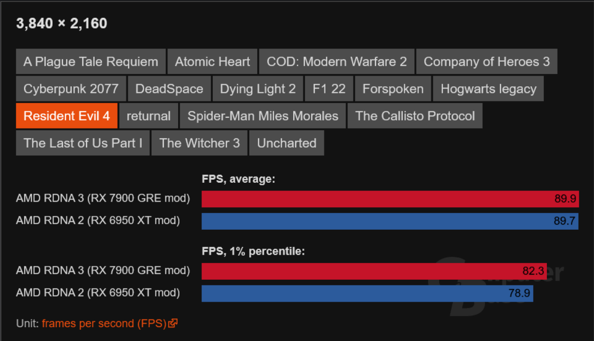 RX 7000 시리즈 GPU는 RX 6000 시리즈 GPU보다 거의 빠르지 않으며 4K 래스터화에서 4~5% 정도의 델타만 남습니다. RX 7900 GRE가 RX 6950 XT보다 최대 10% 더 빠른 타이틀이 몇 개 있지만 델타가 오류 범위 내에 있어 둘의 균형을 유지하는 게임도 많습니다.