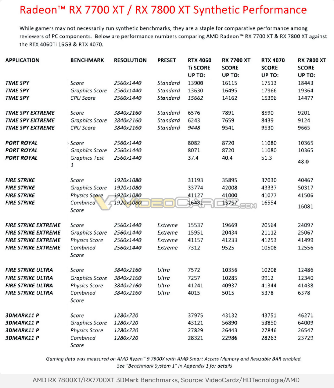 HDTecnologia는 최근 9월 6일 출시 예정인 RX 7800 XT 및 RX 7700 XT 그래픽 카드에 관한 AMD의 공식 데이터를 공유했습니다. 이 정보 중 일부는 이전에 AMD의 공개 행사에서 공개되었을 수 있지만, 이 새로운 유출은 보다 광범위한 게임 타이틀 목록을 제공하고 초기 프레젠테이션에는 눈에 띄게 누락된 합성 벤치마크를 포함합니다.
