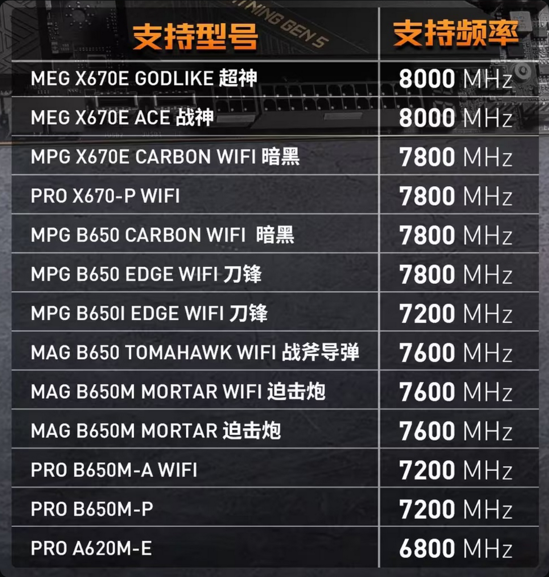 이제 MSI는 AM5 마더보드 라인업이 지원할 수 있는 업데이트된 DDR5 주파수의 전체 목록을 출시했습니다. 최상위 라인업부터 시작하여 현재 최대 DDR5-8000 메모리를 지원하는 주력 MEG 제품인 X670E GODLIKE 및 X670E ACE가 있습니다. 이전에는 두 보드 모두 DDR5-6666+ 및 DDR5-6600+ 메모리를 지원했기 때문에 새로운 속도는 크게 향상되었습니다.