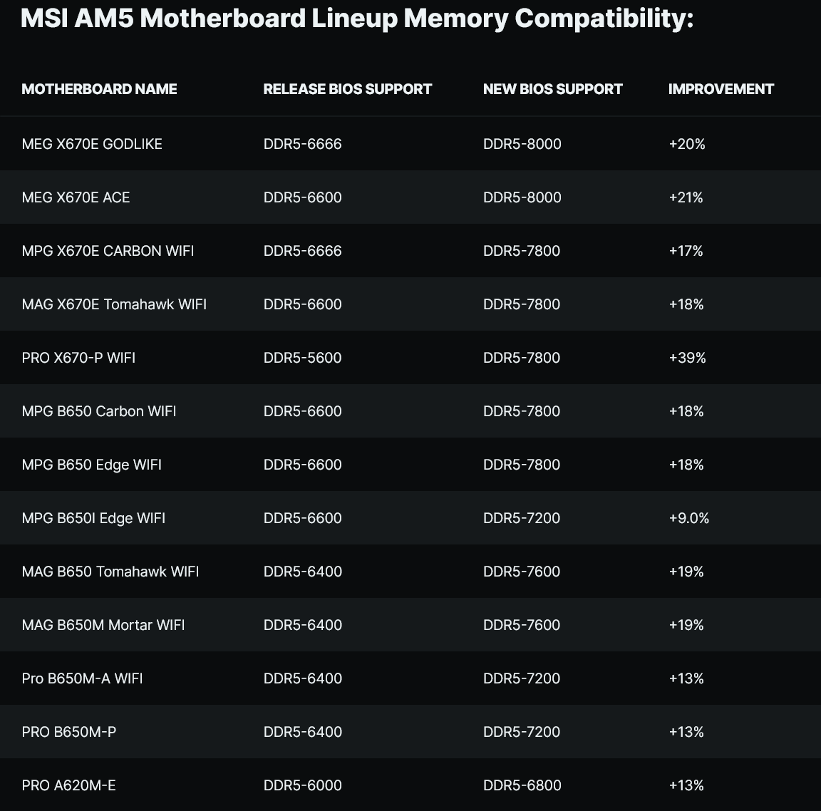 다음은 새로운 AGESA 1.0.0.7c BIOS 업데이트가 MSI AM5 마더보드 라인업에 대한 DDR5 지원에 어떤 영향을 미치는지입니다.