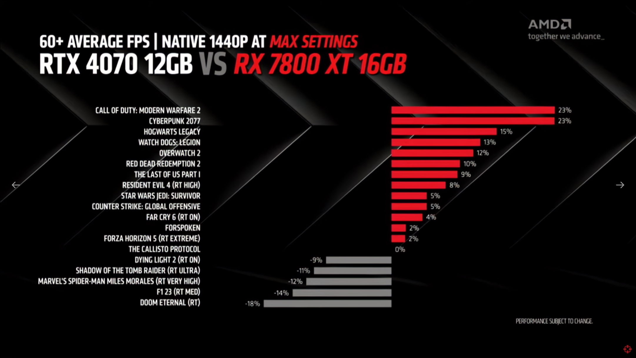 다시 한번 공식 성능 수치 에 따르면 AMD Radeon RX 7800 XT 16GB는 미국에서 100달러 더 낮은 가격으로 RTX 4070 12GB의 경쟁자이며 Radeon RX 7700 XT는 RTX 4060 Ti 16GB와 경쟁하게 됩니다. 최근 경쟁사의 가격 인하 이후 동일한 가격대로 판매됩니다.