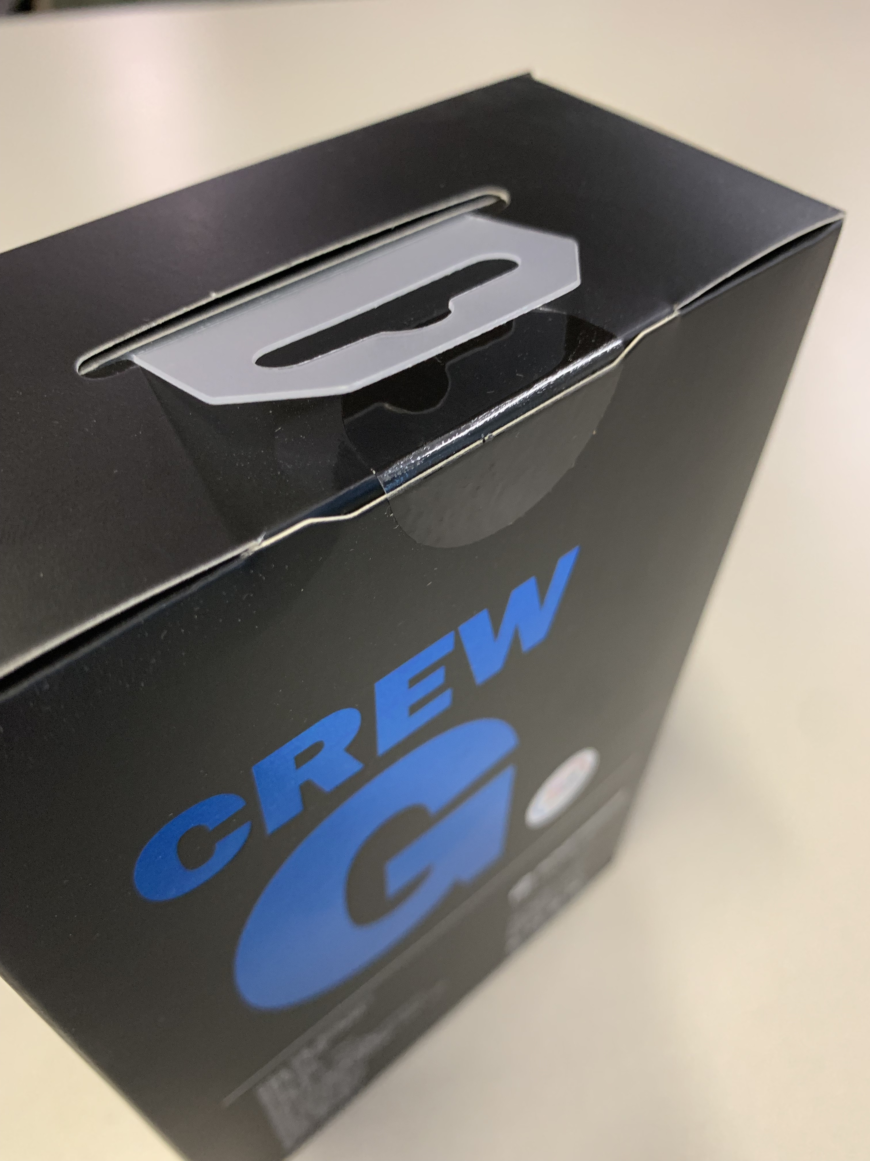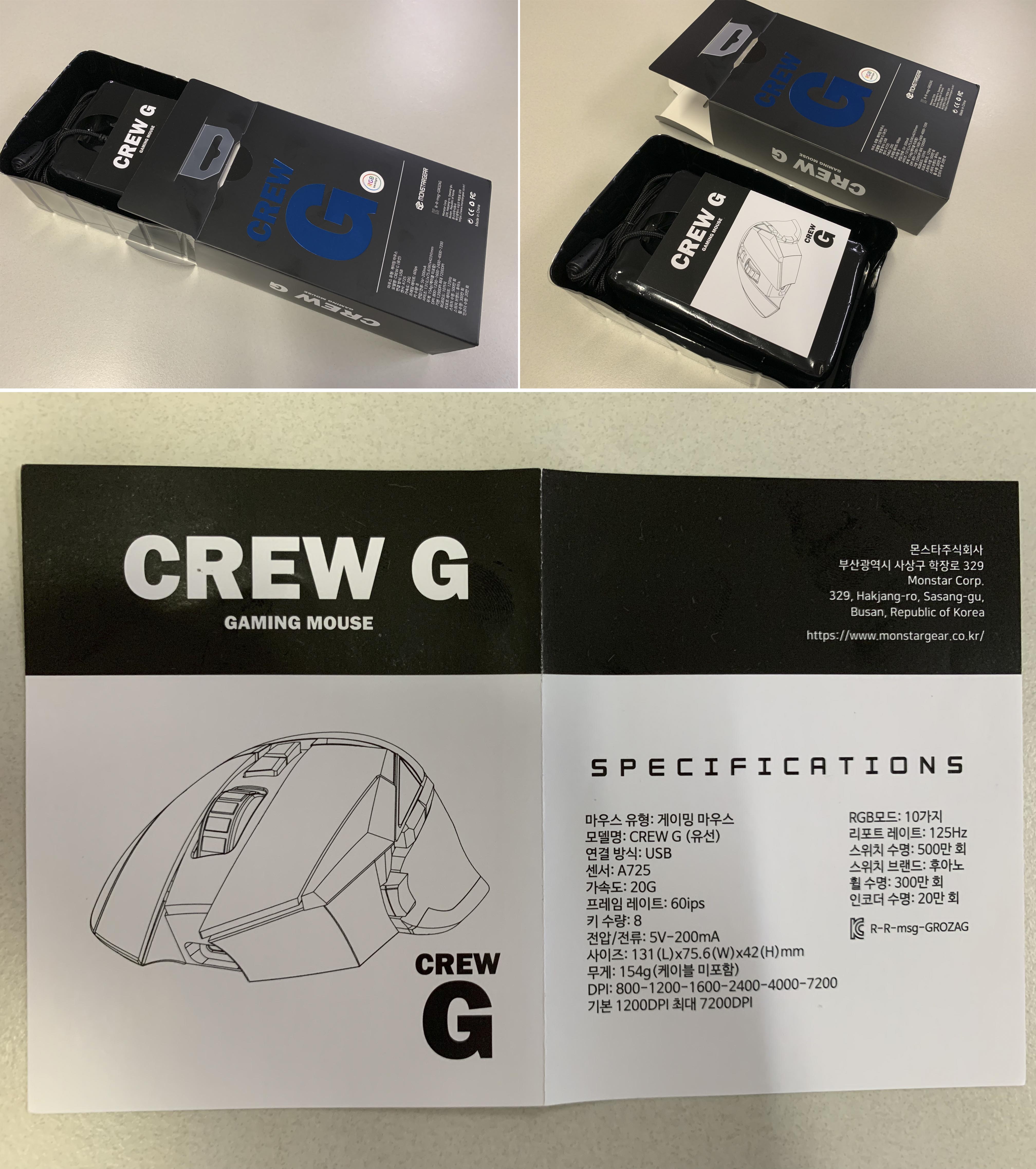 박스에는 MONSTARGEAR 로고, CREW G 제품명, 박스 뒷면 하단에는 기본적인 정보를 확인할 수 있습니다.