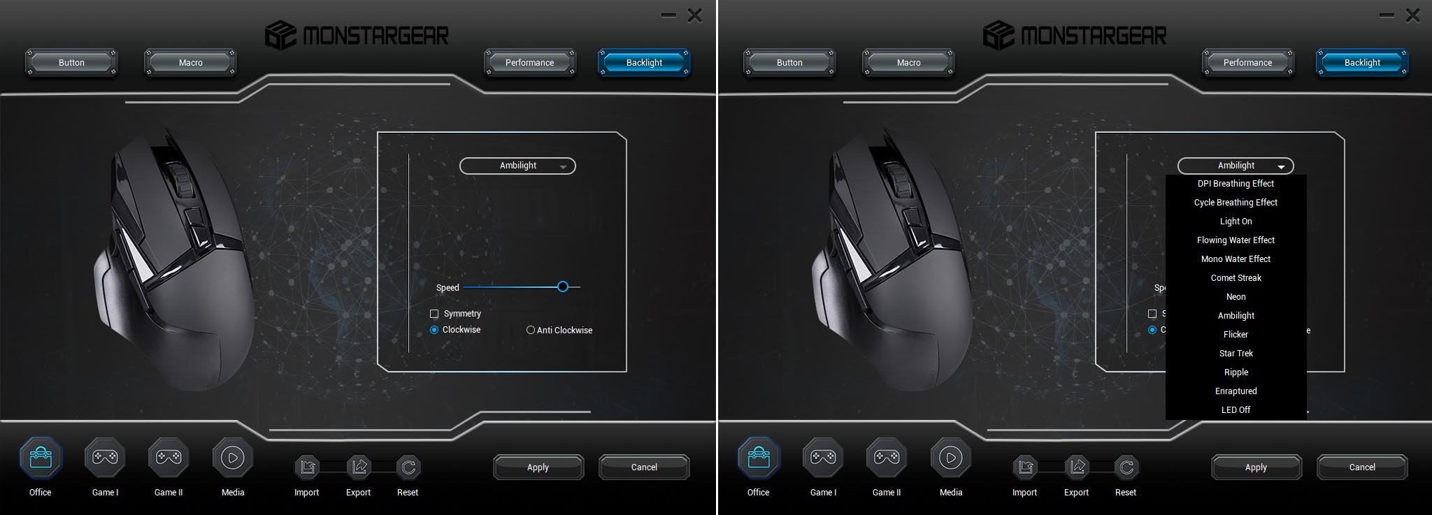 버튼, 매크로, 퍼포먼스, 백라이트 4가지 메뉴로 구성되어 있습니다.