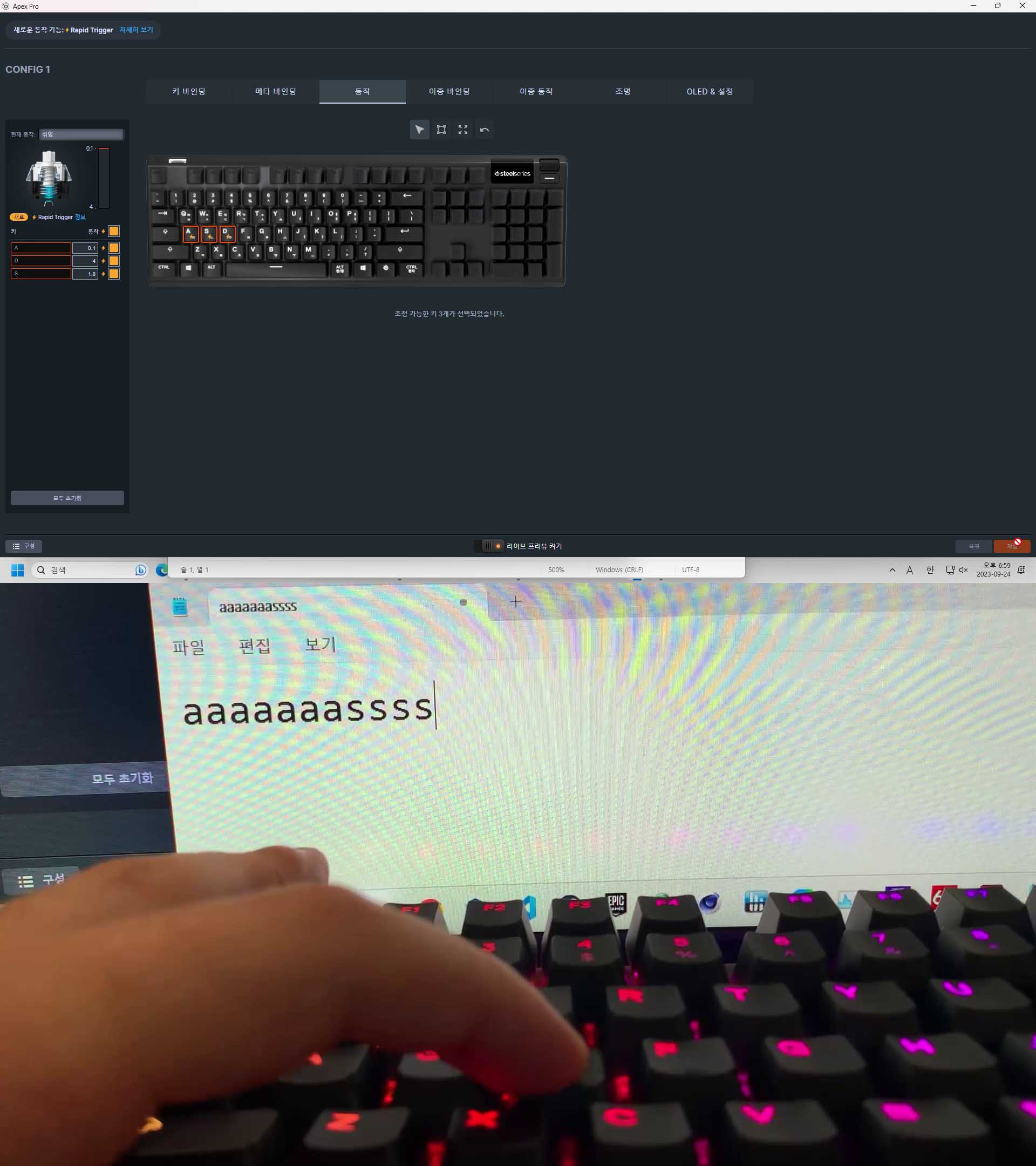 A키 0.1mm / S키 1.8mm / D키 4.0mm를 각각 설정하고 키보드를 누를때, 입력이 되는 지점을 확인할 수 있습니다.