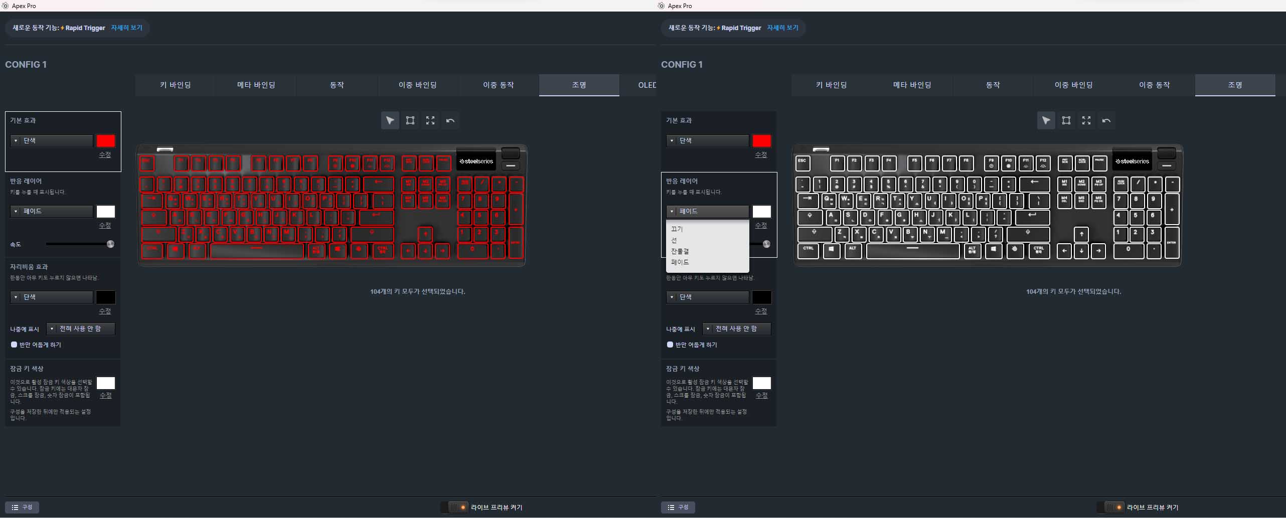 커스터마이징 풀 RGB 조명은 전용 소프트웨어(SteelSeries GG)를 이용하거나 온보드 컨트롤을 통해서 변경 가능합니다.