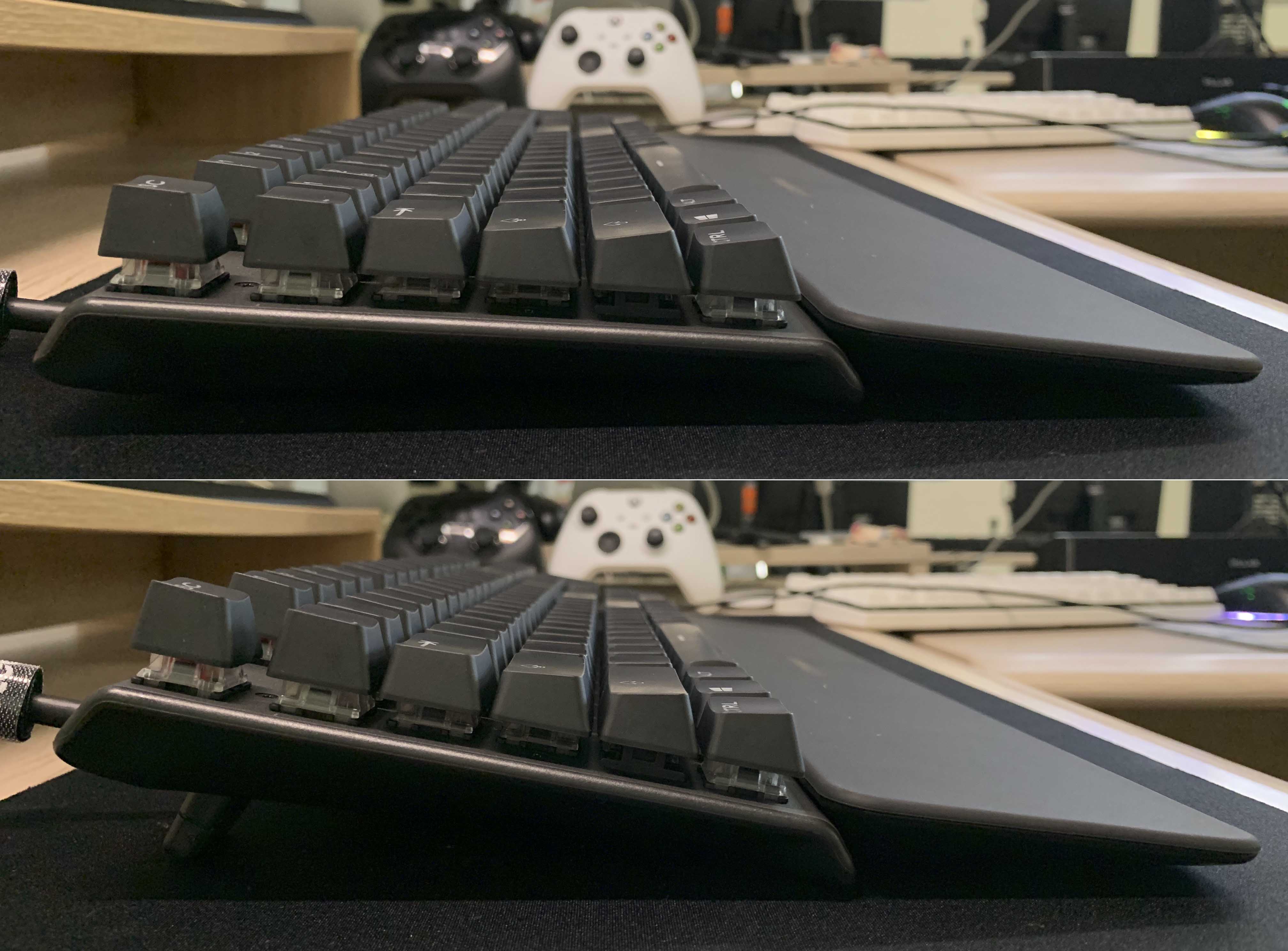 타건시 걸림없이 부드럽게 바닥에 닿는 기분 느낌이며, 리니어 계열의 적축과 비슷하지만 조금 더 쫀득한 느낌이 들고, 타건음은 적축보다는 조금 더 큰 듯합니다. 스테빌라이저에서 나는 소음은 거의 없고, 알루미늄 합금 프레임 재질이라 통울림을 거의 못 느낄 정도로 준수했습니다. 키캡과 팜레스트의 표면이 손끝과 손목을 잘 감아주는 느낌이라 기분 좋은 타건감을 느낄수 있습니다.