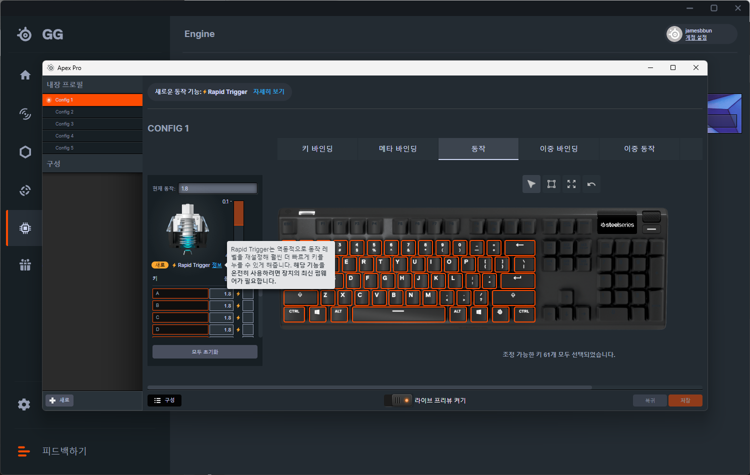 [동작]탭에서 래피드트리거 설정이 가능하며, 래피드 트리거 기능은 OmniPoint 2.0 스위치가 적용되는 영/숫자 클러스트에서만 작동합니다.