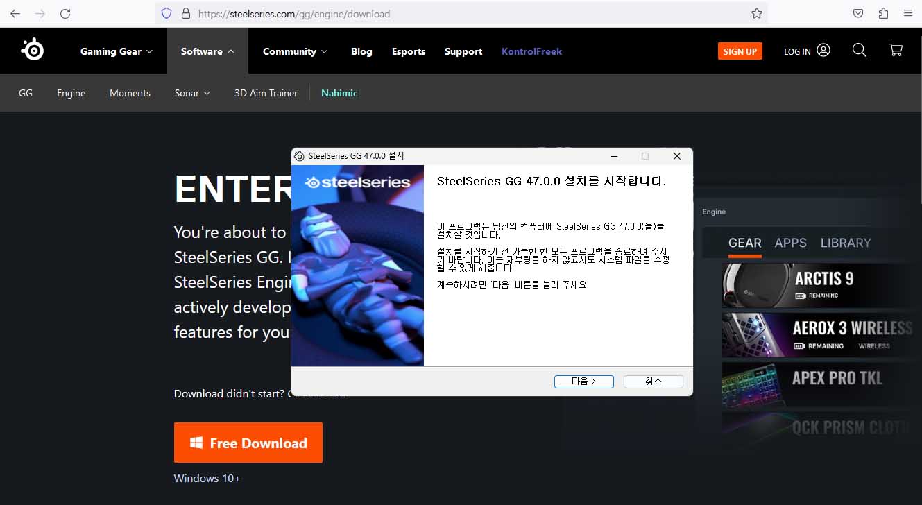 전용 소프트웨어 SteelSeries GG(https://steelseires.com/gg/engine/download)를 다운 받고, 설치합니다.