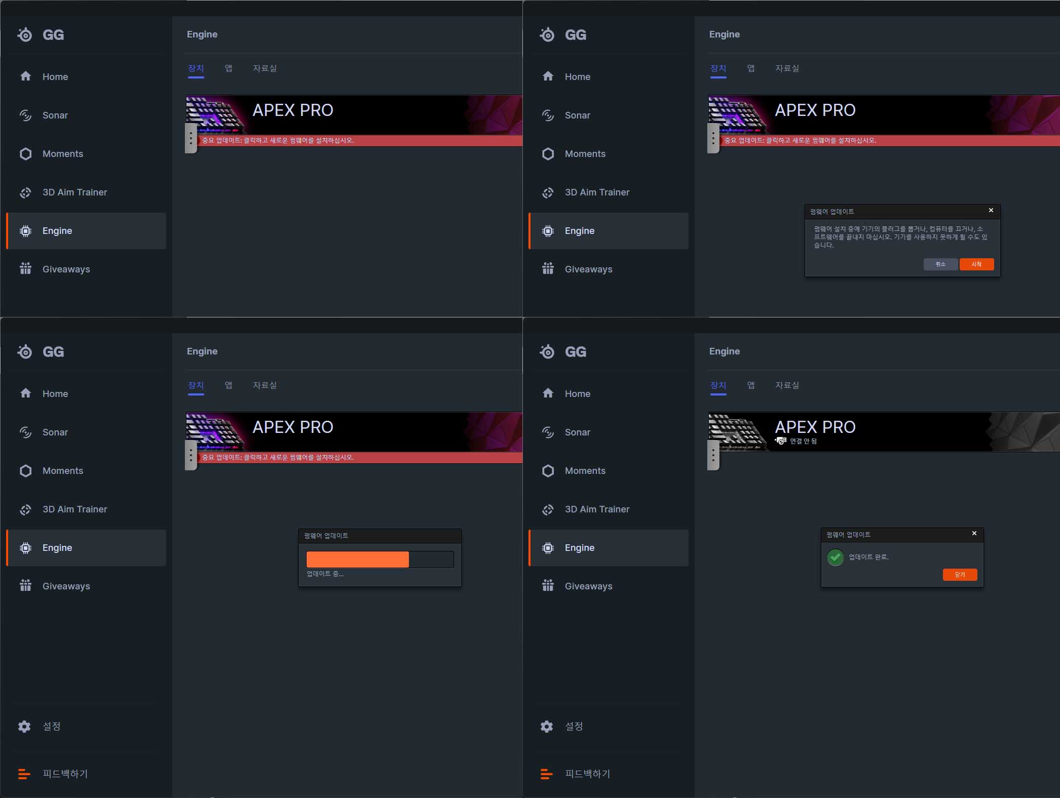 실행하고 Engine 탭에서 APEX PRO 키보드를 확인합니다. 펌웹이어 업데이트가 필요할 경우, 안내문에 따라 진행합니다.