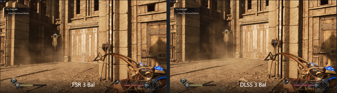 다음은 7x 클로즈업 입니다 . 이제 FSR 3의 단점을 볼 수 있습니다. 문을 감싸고 있는 철제 막대에 상당한 양의 앨리어싱(재기스)이 있습니다. 동시에 DLSS 3은 여전히 꽤 바래고 약간 흐릿해 보입니다. 본질적으로 세부 사항과 앨리어싱을 위해 부드러움을 교환하고 있습니다. 여기서 주목해야 할 중요한 점은 최신 버전의 DLSS 3에서는 개발자가 Streamline 프레임워크 외부에서 선명도 필터를 구현해야 한다는 것입니다. 나는 Ascendant Studios가 Aveum에서 그런 일을 했다고 생각하지 않습니다.