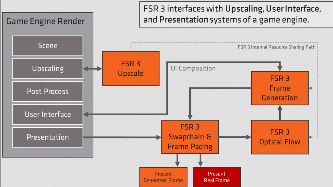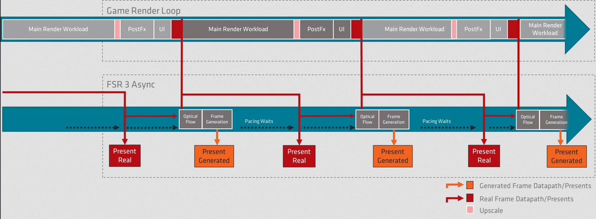 AMD의 뜨거운 기대를 받고 있는 FSR 3 업스케일러가 이제 다양한 타이틀에서 이용 가능합니다. FSR 2와 같은 저해상도 이미지를 확대하는 것 외에도 Fluid Motion Frames Interpolation 기술을 사용하여 기존 두 이미지 사이에 추가 프레임을 추가하여 성능을 평균 2배 향상시킵니다. FSR 3 알고리즘은 입력을 위해 게임 UI, 업스케일링 및 프레젠테이션 시스템과 인터페이스하여 생성된 프레임을 실제 프레임과 동시에 생성합니다.
