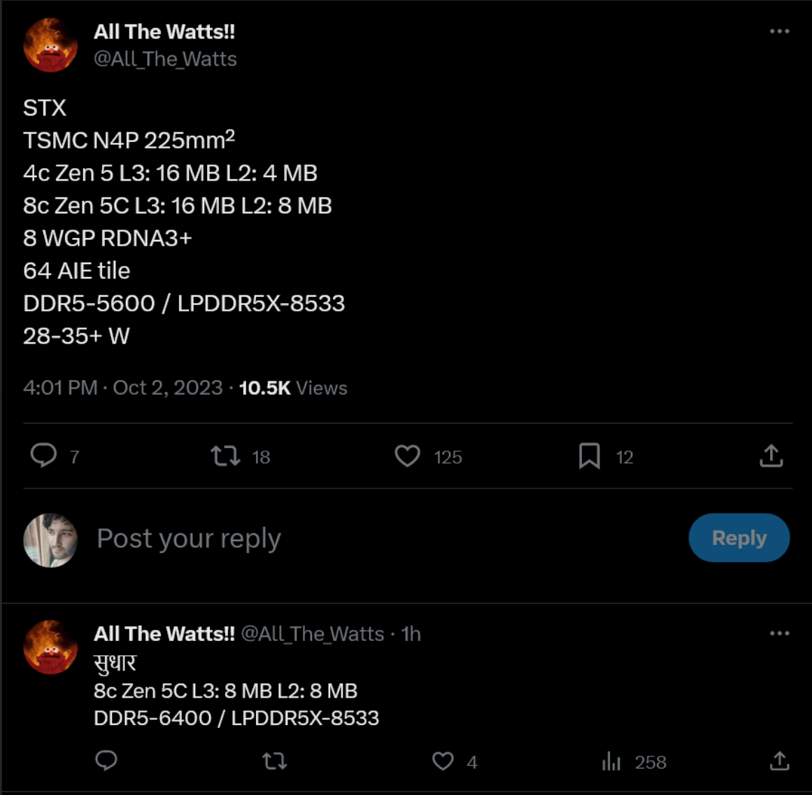 차세대 Ryzen 8000 프로세서는 크게 업그레이드된 AI 엔진을 특징으로 합니다 . Strix Point는 Phoenix의 4 배인 최대 64개의 AIE 타일을 포장합니다 . 이러한 모빌리티 칩은 기본적으로 DDR5-6400 메모리를 지원하며 LPDDR5x-8533 변형도 계획되어 있습니다. 이러한 APU는 28W 울트라북과 35~45W 고성능 게임 노트북을 대상으로 하는 모놀리식이며 확장성이 뛰어납니다. TSMC의 N4 프로세스 노드를 사용하여 제조됩니다 .