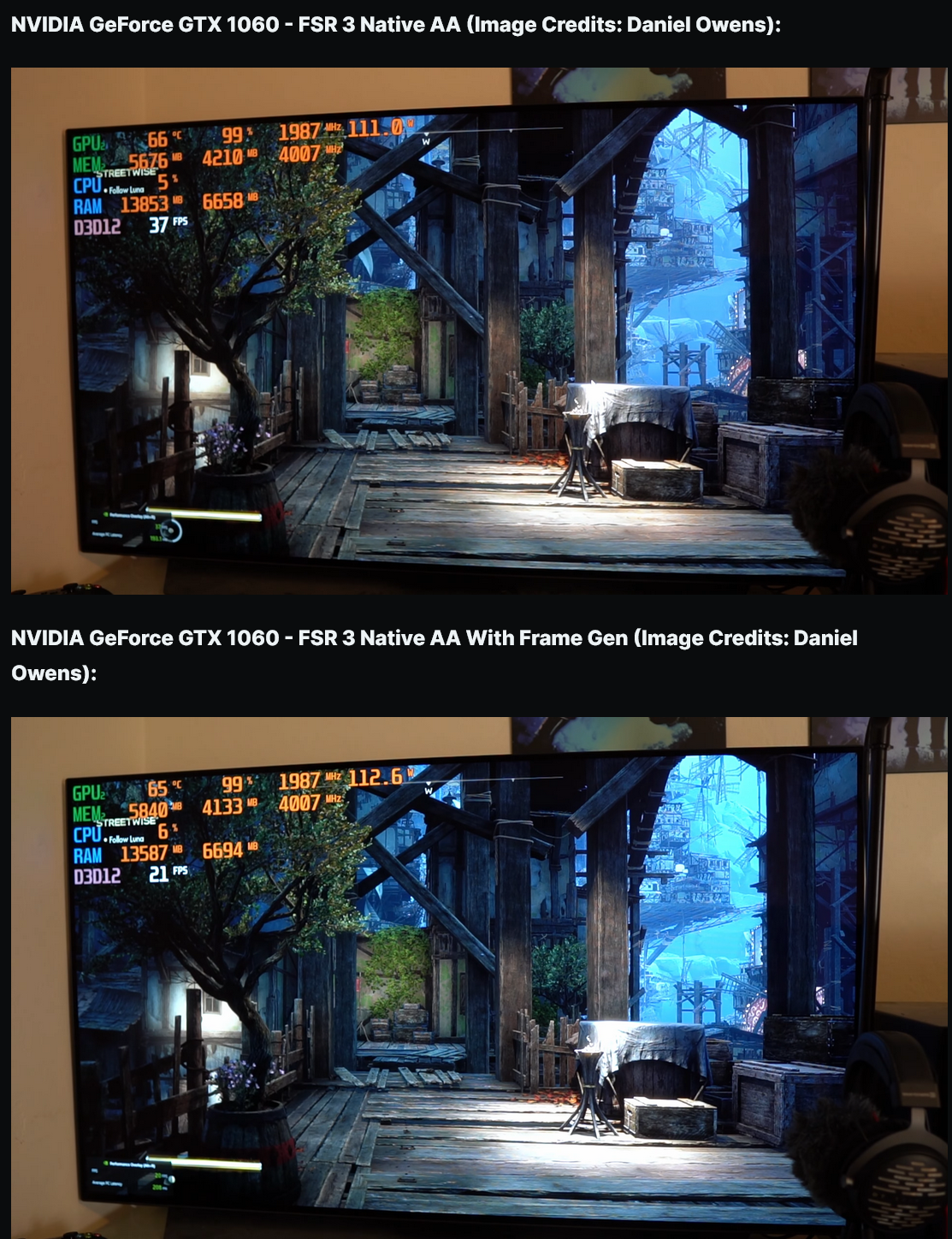 AMD FSR 3은 NVIDIA GeForce 10 시리즈와 같은 훨씬 오래된 GPU도 지원합니다. 지원은 업스케일링으로 제한되지만 Daniel Owens는 이전 GeForce GTX 1060 및 GeForce GTX 1070 카드를 테스트하고 FSR 3 프레임 생성이 활성화되었을 때 어떤 일이 발생했는지 확인합니다. 테스트 중에 그는 FSR 3 Frame Gen을 활성화하면 전체 FPS가 향상된다는 사실을 발견했습니다. GeForce GTX 1060 GPU에서 기본 AA 모드를 사용하면 약 200ms의 대기 시간으로 평균 약 20-22FPS를 얻었지만 프레임 생성 기능을 활성화하면 FPS가 32-34로 향상되어 50% 이상 향상되었습니다. 중대하다.