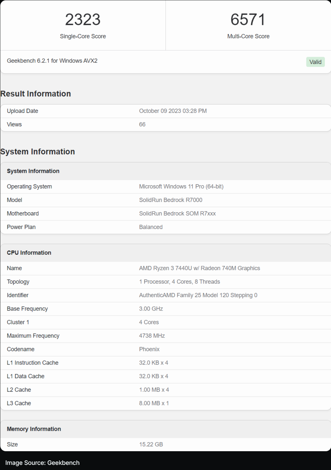 성능 측면에서는 AMD Ryzen 3 7440U "Phoenix" APU가 Geekbench 6 내 싱글 코어 테스트에서 2323점, 멀티 코어 테스트에서 6571점을 기록했습니다 . 테스트 설정은 패시브 냉각 설계, DDR5 SO-DIMM 메모리(테스트에서 16GB) 지원 및 광범위한 IO 기능을 갖춘 SolidRun Bedrock R7000 미니 PC였습니다. CPU는 모든 Zen 4 코어에서 최고 4.7GHz 클럭으로 실행되었습니다. 이는 수동 냉각 솔루션이 제 역할을 잘 수행했음을 의미합니다.