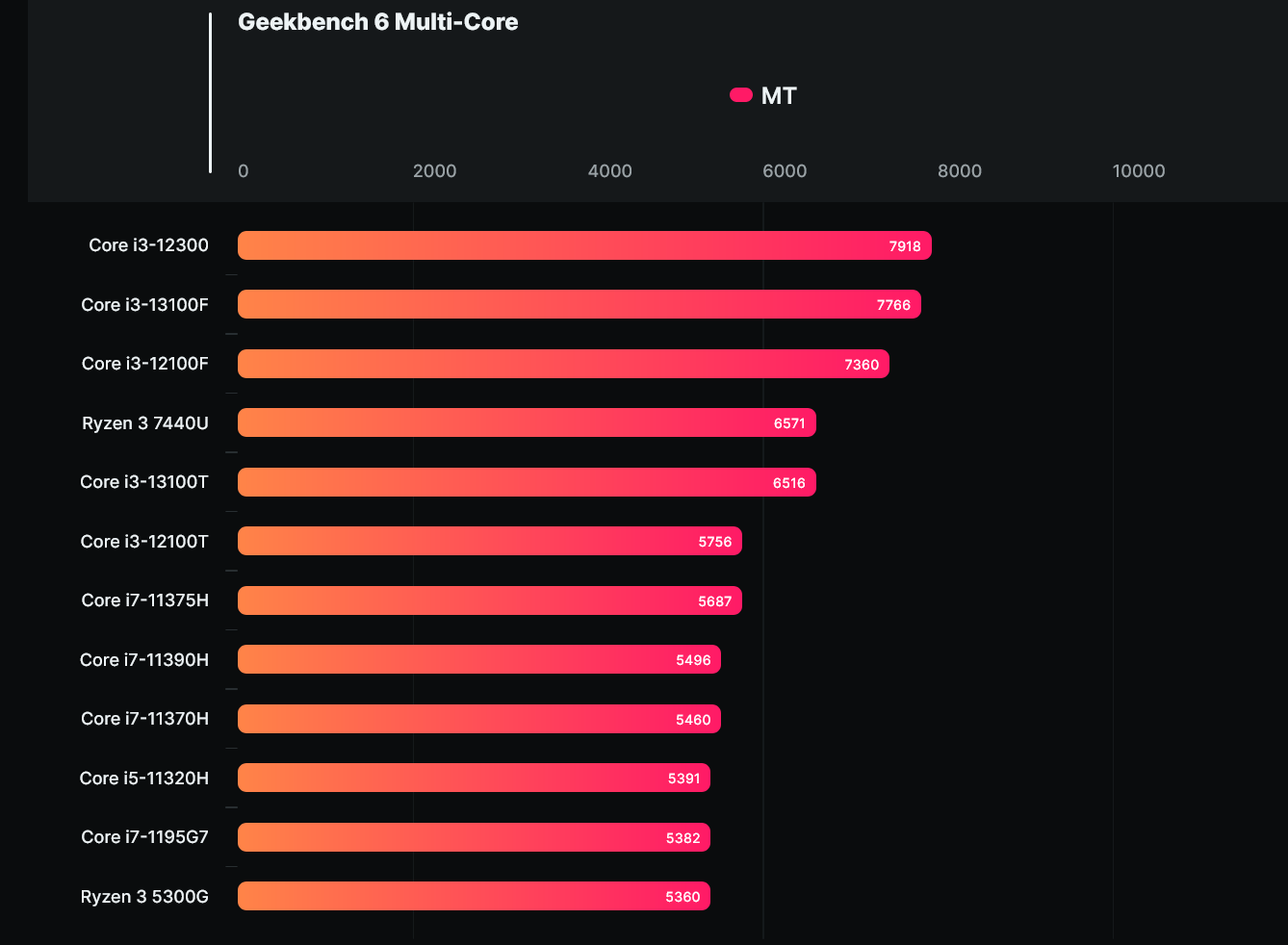 위의 벤치마크에서 AMD Ryzen 3 7440U "Phoenix" APU가 Zen 4의 IPC 향상 및 클럭 속도 향상 덕분에 단일 스레드 벤치마크에서 다른 모든 쿼드 코어 칩보다 편안하게 앞서 있음을 확인할 수 있습니다. 한편, Intel Raptor Lake 및 Alder Lake 칩은 더 높은 TDP 및 캐시 양과 관련된 멀티 코어 부문에서 선두를 달리고 있지만 28W의 7440U는 매우 효율적인 칩입니다. 데스크탑 Zen 4 쿼드 코어 APU는 결국 가장 빠른 4코어 칩이 되어야 하지만 AMD가 AM5용 8코어 및 6코어 APU 외에 다른 것을 제공할지는 두고 볼 일입니다.