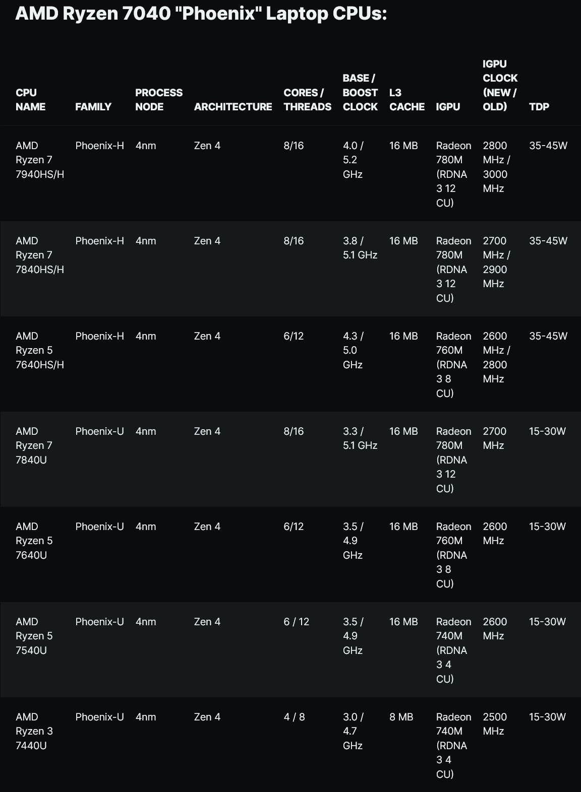 어쨌든, 사양으로 넘어가면 AMD Ryzen 3 7440U "Phoenix" APU는 4개의 Zen 4 코어, 8개의 스레드, 3.0GHz의 기본 클럭, 최대 4.7GHz의 부스트 클럭을 갖추고 있습니다. 이 칩에는 4MB의 L2 캐시와 8MB의 L3 캐시가 있으며 28W(15~30W 구성 가능 TDP)에서 작동하도록 평가되었습니다. APU는 또한 2.5GHz 클럭 속도로 실행되는 4개의 컴퓨팅 유닛을 갖춘 RDNA 3 그래픽 아키텍처 기반의 Radeon 740M iGPU를 갖추고 있습니다. CPU는 또한 하이브리드 Zen 4 및 Zen 4C 구성 으로 새로운 Phoenix2 다이를 활용합니다 .