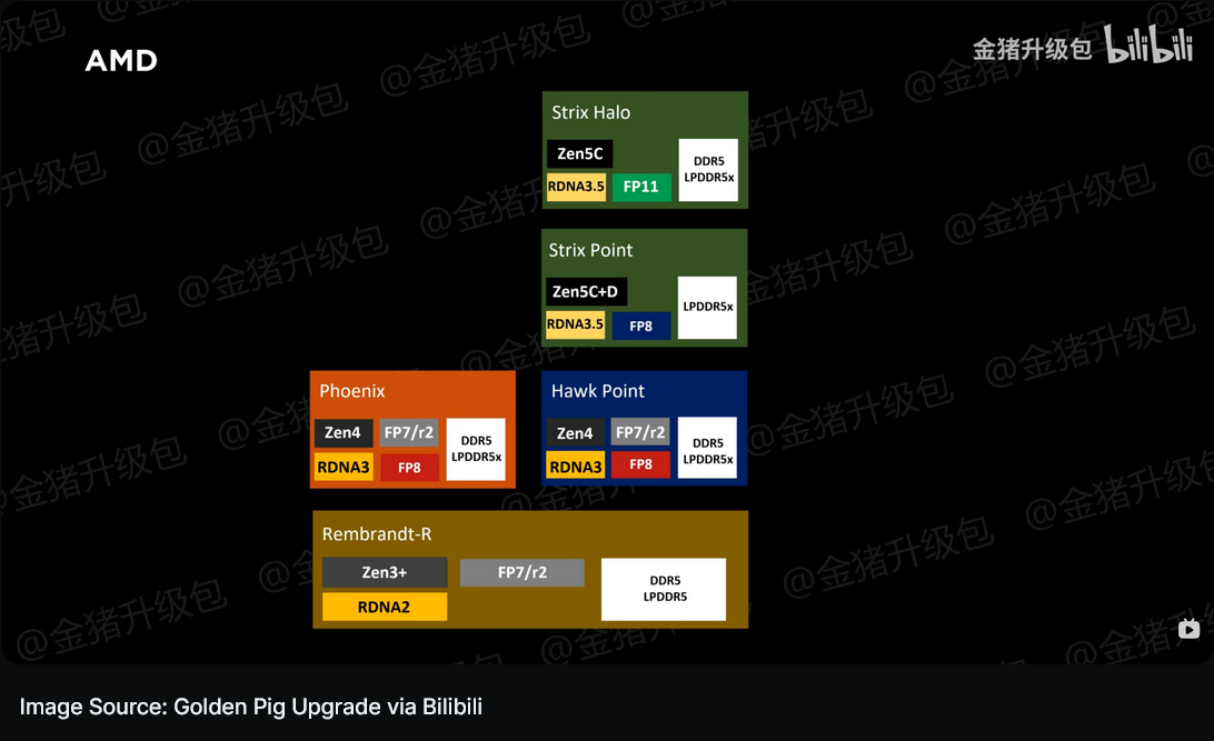 최신 정보는 Bilibili의 Golden Pig Upgrade에서 나온 것입니다. 여기에는 몇 가지 새로운 추가 사항과 함께 우리가 오랫동안 알고 있던 데이터가 대부분 포함되어 있습니다. 여기에서 다루는 노트북 라인업에는 2023년부터 2025년까지 AMD와 Ryzen의 차세대 제품이 포함됩니다. AMD 제품군을 시작으로 AMD는 Phoenix Ryzen 7040 APU 에 Hawk Point "Ryzen 8040" 및 Strix Point "Ryzen 8050" 시리즈 라는 두 가지 새로운 제품군을 출시할 예정입니다 .
