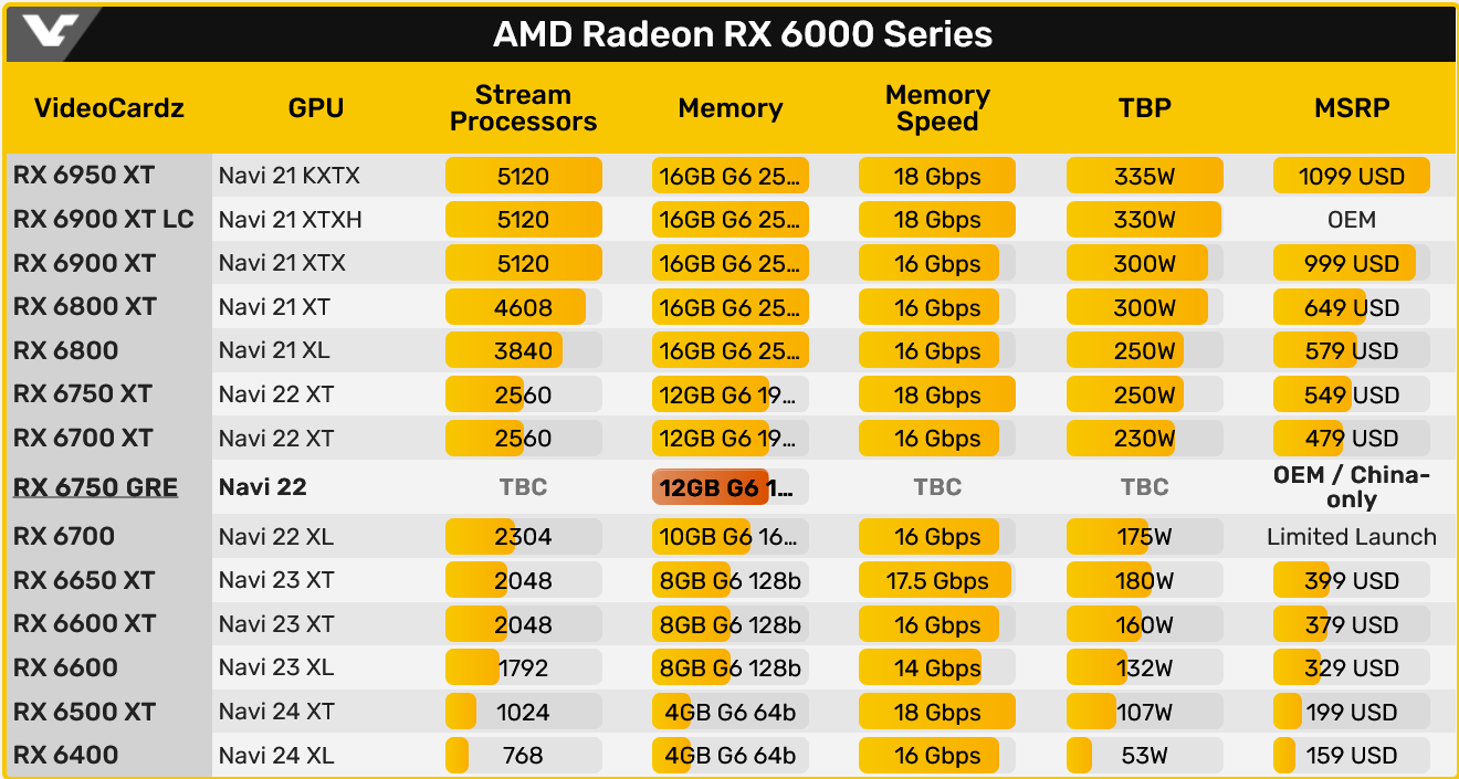 이전 추측과 달리 Gigabyte China는 이 모델이 대신 12GB 메모리를 탑재할 것이라고 밝혔으며, 이는 이전 소문이 틀렸음을 입증합니다. 이에 비추어 볼 때, 정확한 GPU 사양은 아직 확인되지 않았습니다. 이 카드는 Navi 22 GPU를 기반으로 할 가능성이 높지만 이 칩에 활성화된 스트림 프로세서의 수는 여전히 불확실합니다. GRE 모델이 보다 예산 친화적인 SKU로 설계되었다는 점을 고려하면 예상되는 2304 코어 사양은 놀랄 일이 아닙니다. 불행히도 RX 6750 GRE가 다른 Radeon GPU와 동일한 방식으로 출시될 것이라는 징후는 없습니다.