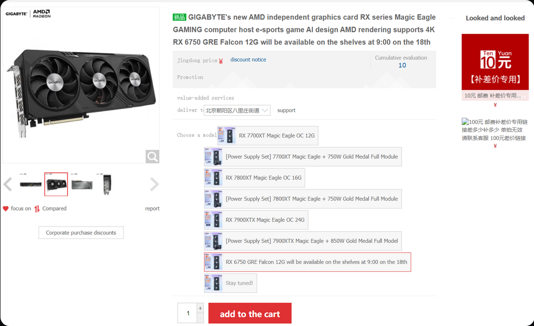 Gigabyte의 공식 JD.com 소매 목록에 따르면 AMD Radeon RX 6750 GRE 12GB 그래픽 카드는 현지 시간으로 10월 18일 오후 9시에 출시될 예정입니다. 나열된 가격은 단지 자리 표시자일 뿐입니다. 그래픽 카드는 이전 보고서 에 따라 GeForce RTX 4060(~$300 US) 가격으로 GeForce RTX 4060 Ti 성능을 제공하기 위한 것이며 그래픽 카드가 장착된 사전 빌드 PC가 이미 시장에 출시되었기 때문에 그럴 수도 있습니다. JD.com .