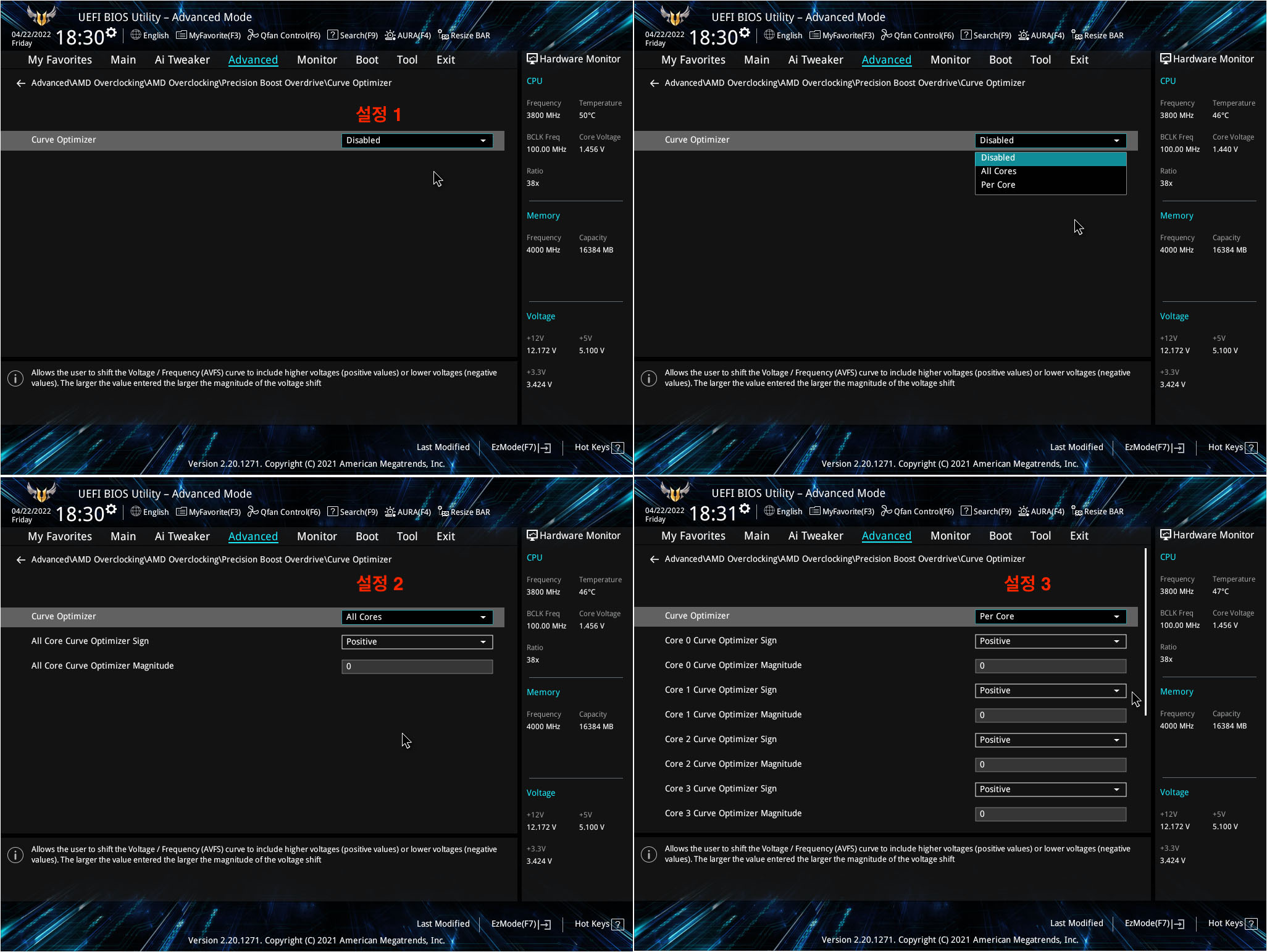 PBO2는 Curve Optimizer 라는 메뉴를 제외한 다른 설정은 PBO Auto 모두 동일합니다. 설정2에서 Curve Optimizer을 설정하지 않고 Disable의 상태라면 PBO Auto와 똑같습니다. 한마디로 코어별로 전압을 조절할수 있는 기능을 제공한다고 생각하시면 됩니다.