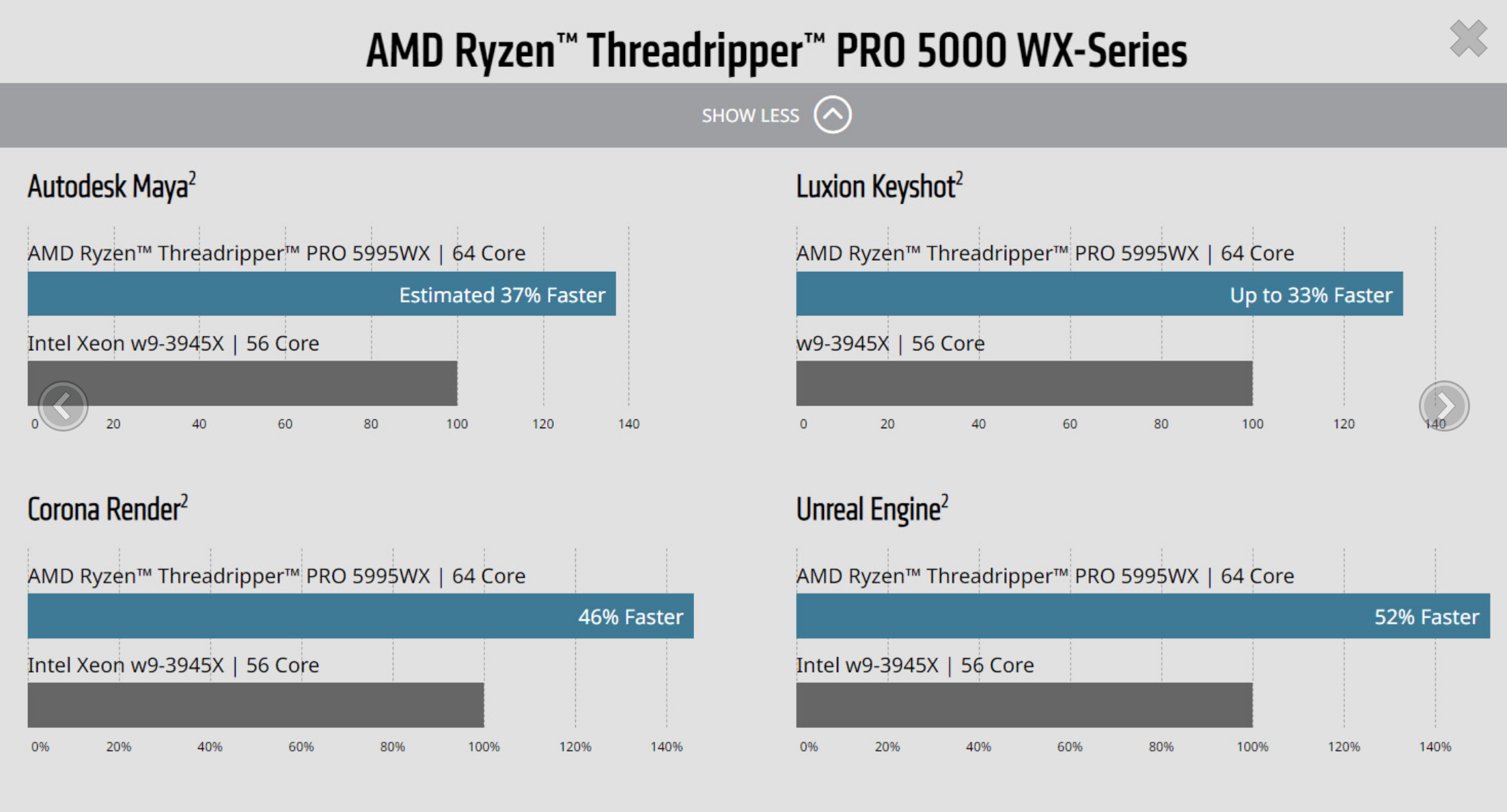 멀티스레드 워크로드의 경우 Threadripper PRO 프로세서는 복잡한 시뮬레이션, 생성 설계, 렌더링 및 소프트웨어 컴파일 작업을 위한 워크스테이션 프로세서 중 가장 많은 코어인 최대 96개 코어와 192개 스레드를 제공합니다. 사용자는 다음과 같은 도구에서 최대 2배 더 빠른 성능을 확인할 수 있습니다. 카오스 V-레이. 또한 Ryzen Threadripper PRO 7000 WX 시리즈 프로세서는 높은 메모리 용량과 대역폭이 필요한 애플리케이션을 위해 DDR5 메모리용 채널 8개와 함께 최대 384MB의 L3 캐시를 제공합니다.