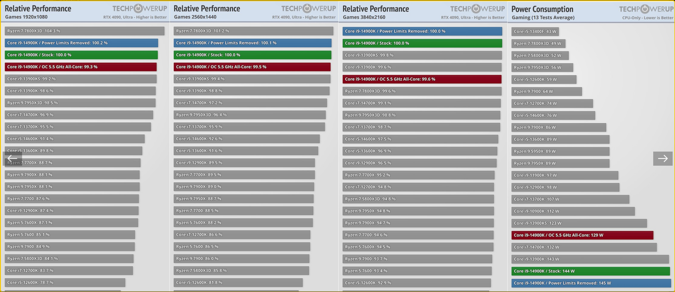 TechPowerUP 리뷰 에 따르면 7800X3D는 1080p 및 1440p 해상도에서 Intel의 최신 주력 제품인 Core i9-14900K보다 빠를 뿐만 아니라 전력 소비도 훨씬 적습니다. 예산이 부족한 게이머들에게 이것은 좋은 소식이며 7800X3D가 더욱 저렴해지고 있다는 점에서 선택의 여지가 분명합니다.