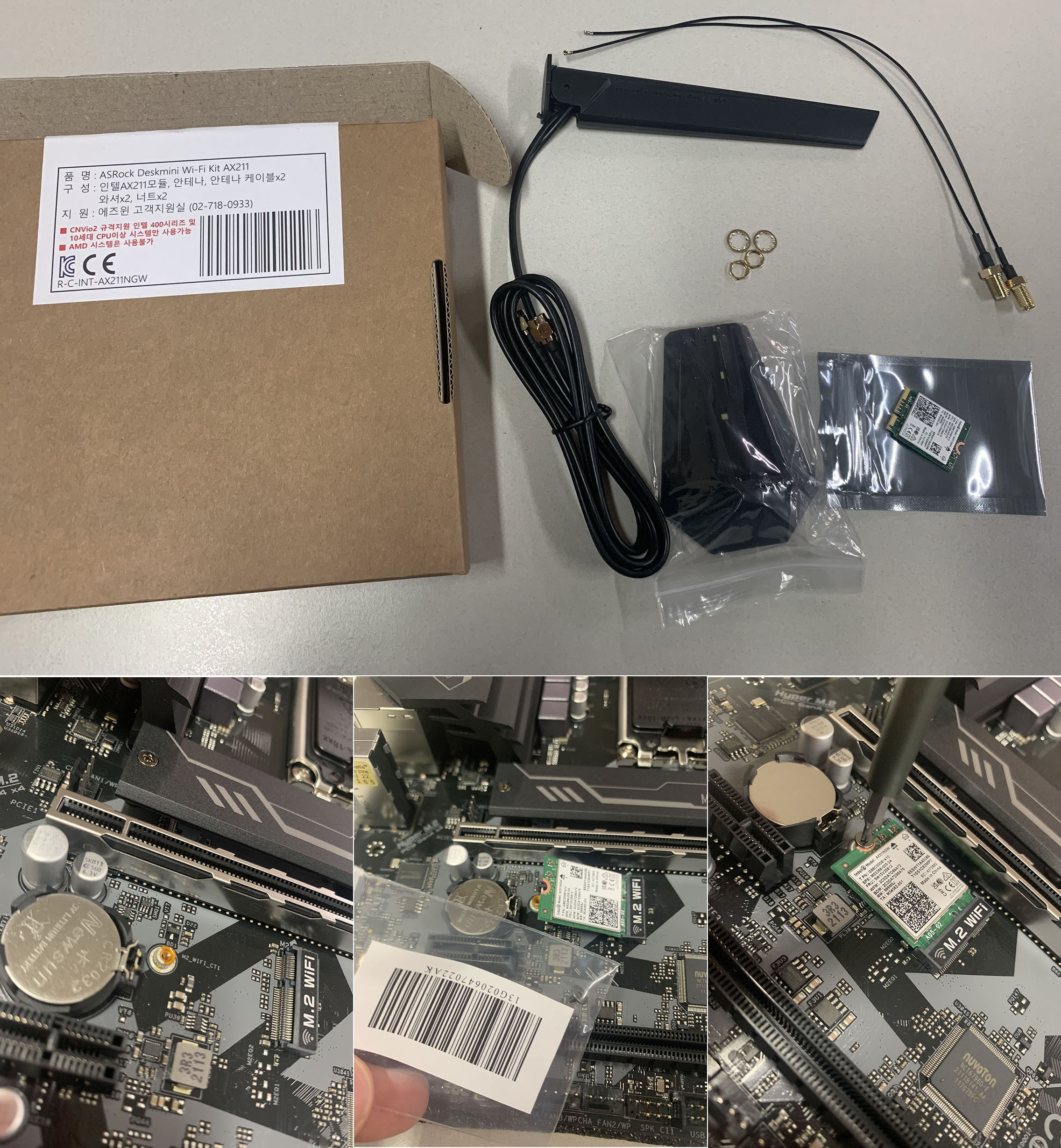 본품, 안테나, 케이블, 받침대가 보입니다. 메인보드에 장착하는 모습니다. 안테나는 설치가 마무리되면 연결해야겠습니다.