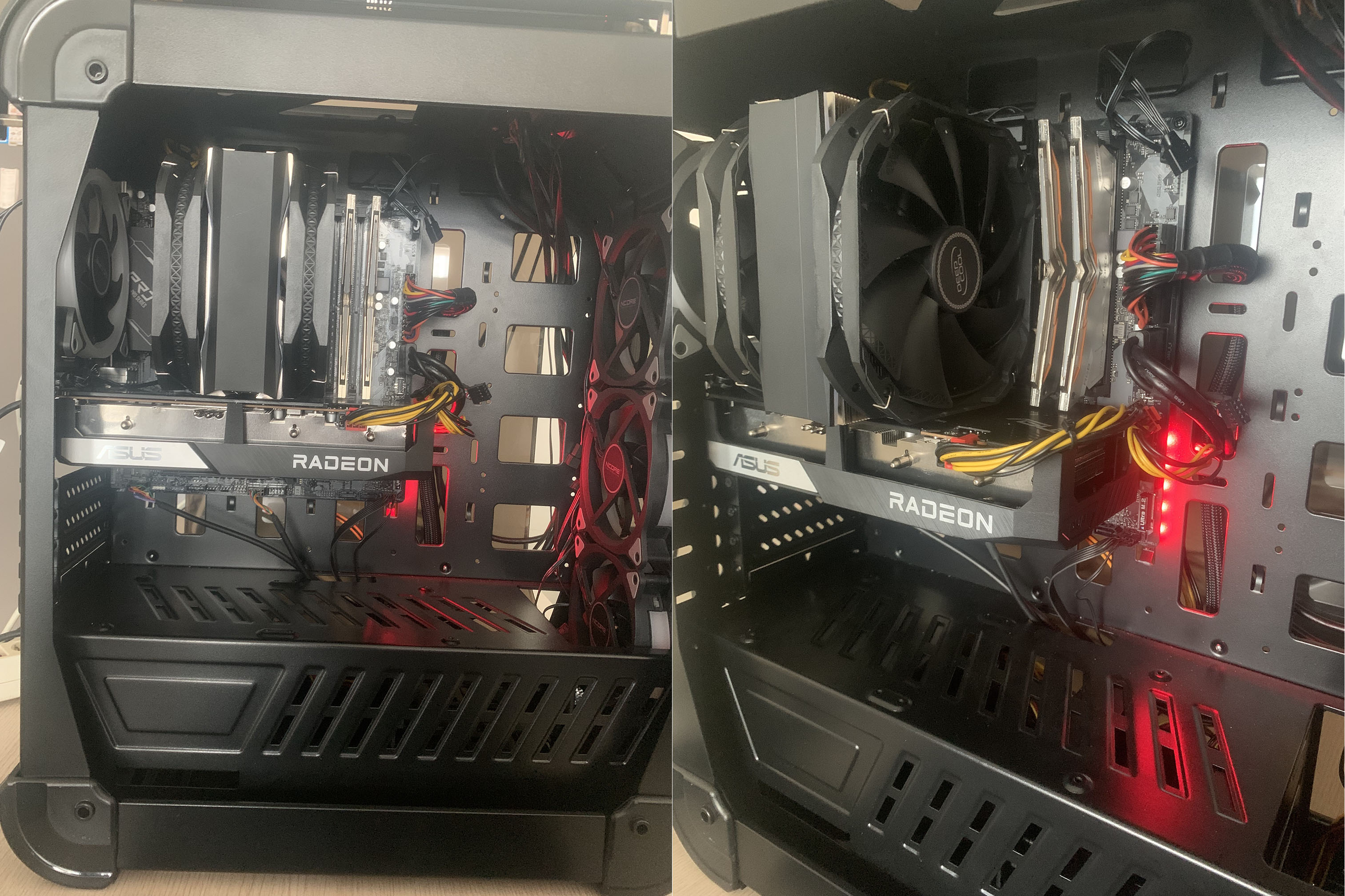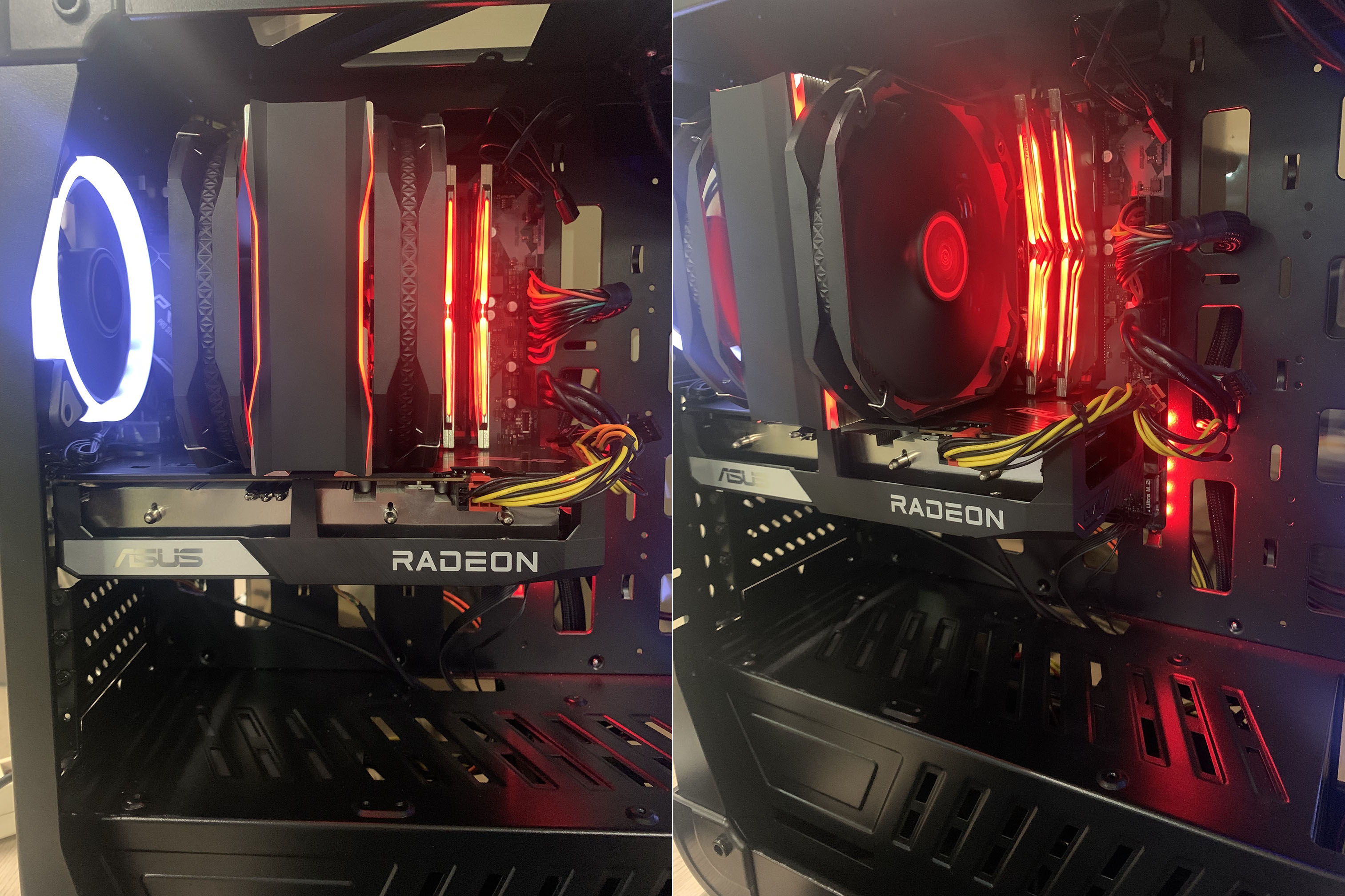 램, 파워, 그래픽카드까지 다 설치한 모습입니다. 쿨러와 그래픽카가 메인보드를 덮어버려서 방열판이 겨우 보이네요.