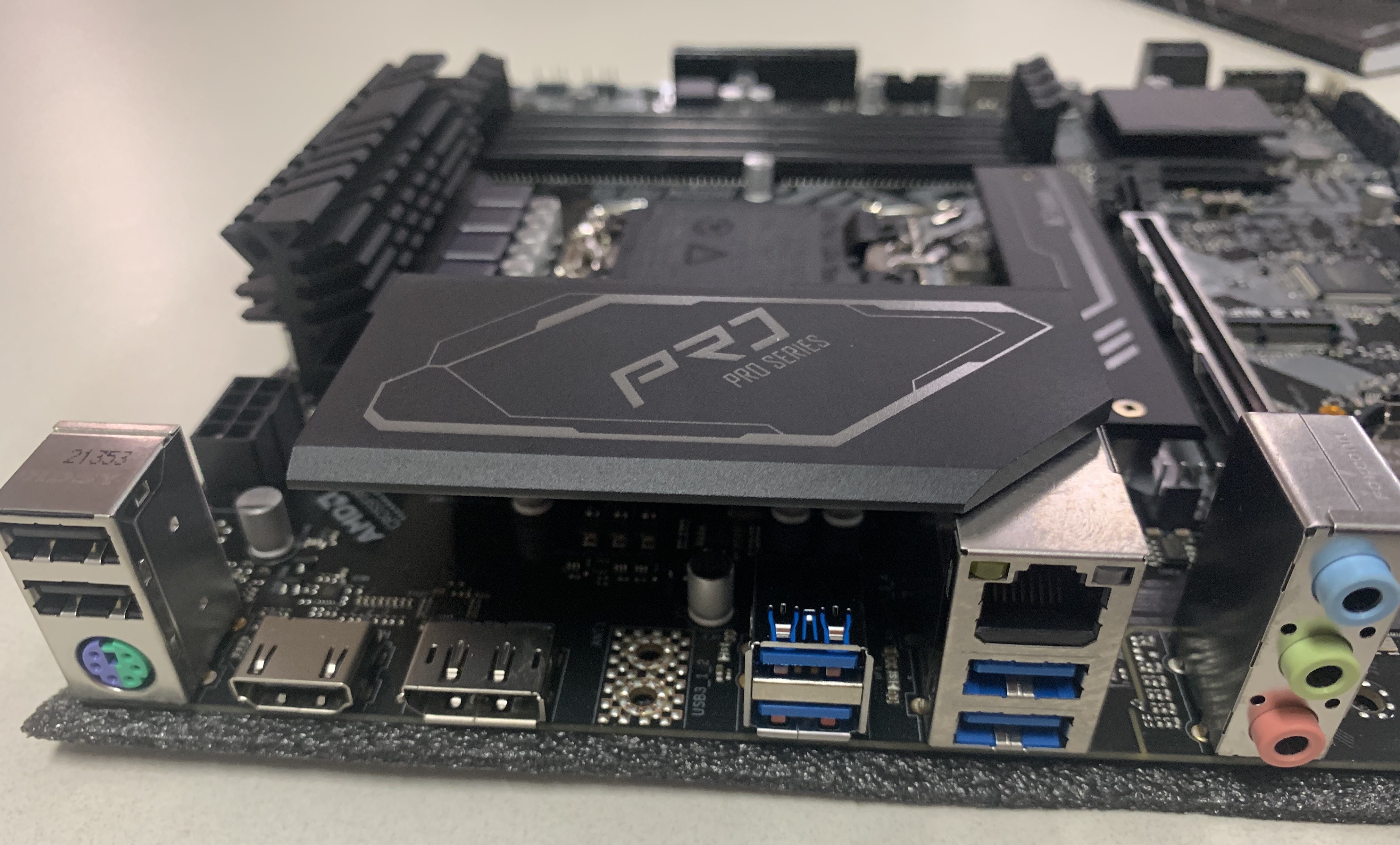 백패널에는 좌측에서 시작해서 USB 2.0 포트 2개와 PS/2 포트 1개, 내장그래픽용 DP1.4 와 HDMI 포트, USB 3.2 Gen1 포트 4개, 1기가비트랜 포트 1개, 사운드 단자로 구성되어 있습니다.