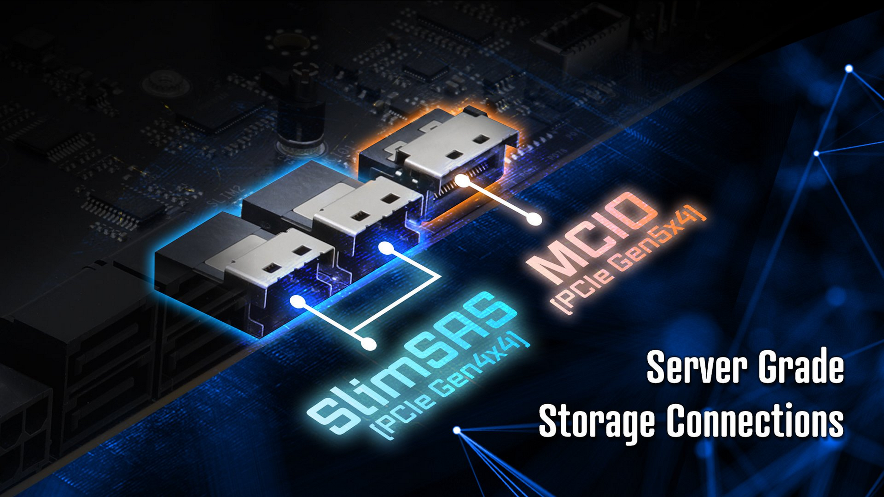 새로운 프로세서는 엄청난 양의 PCIe 5.0 레인과 PCIe 4.0 레인을 제공하며, WRX90에는 144개의 사용 가능한 PCIe 5.0/4.0 레인, TRX50에는 88개의 PCIe 5.0/4.0이 제공됩니다. 두 마더보드 모두 확장을 위한 충분한 양의 PCIe 슬롯이 장착되어 있습니다. 최신 고속 및 안정적인 스토리지 확장 가능성을 제공하는 PCIe 5.0 x4 'Blazing' M.2 NVMe SSD 소켓, SlimSAS(SFF-8654) 및 MCIO 커넥터는 다양한 스토리지 옵션을 제공하여 차세대 고급 데스크탑 또는 심지어는 완벽한 선택이 됩니다. 워크스테이션 빌드.
