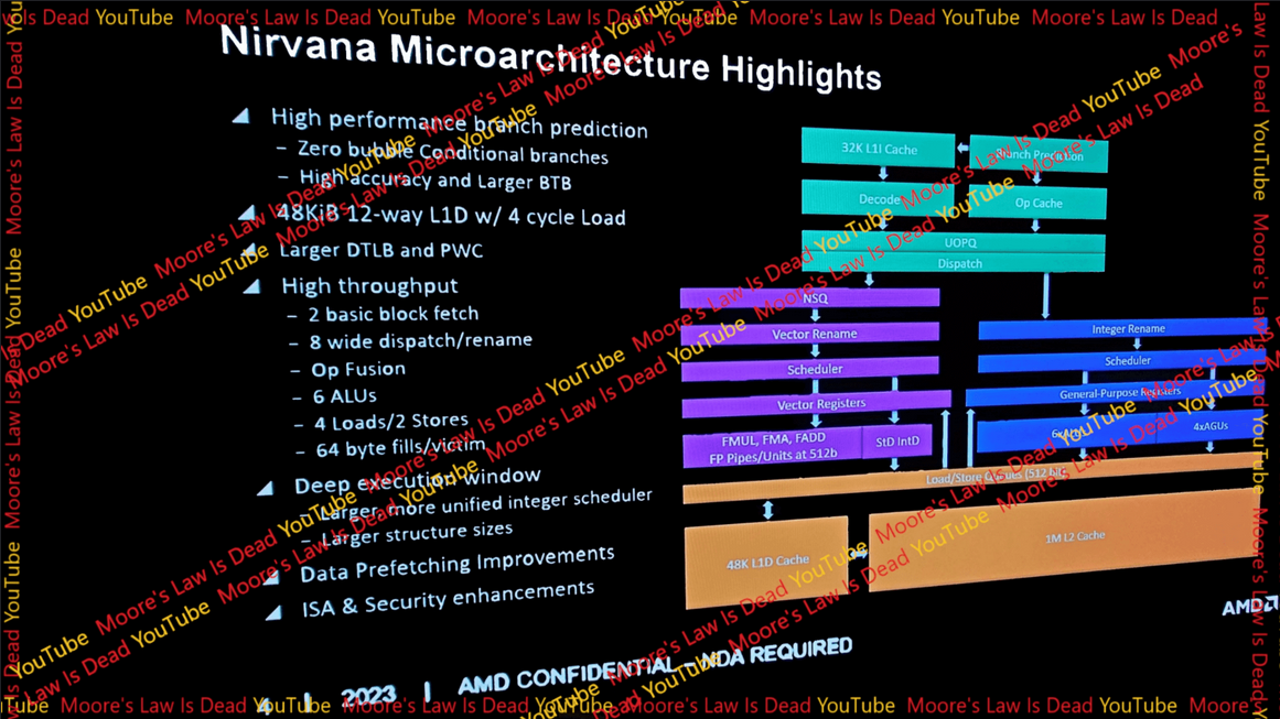 우리는 지금까지 AMD의 차세대 Ryzen 8000 프로세서에 대해 상당히 알고 있습니다. 여기에는 핵심 아키텍처, 프로세스 기술, 캐시 구조 및 스레드 수가 포함됩니다. 무어의 법칙은 죽었다(Moore's Law is Dead) 의 9월 말 유출을 통해 우리는 Zen 5 코어 와 그 기능에 대한 더 미세한 세부 사항을 처음으로 살펴볼 수 있었습니다 . 코드명 "Nirvana"인 Zen 아키텍처의 5번째 반복은 단일 스레드 성능에 초점을 맞춰 Ryzen 8000 CPU의 게임 성능을 크게 향상시킵니다.