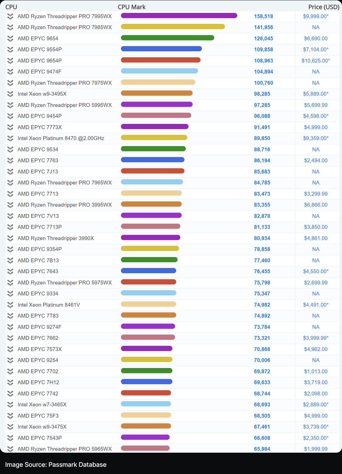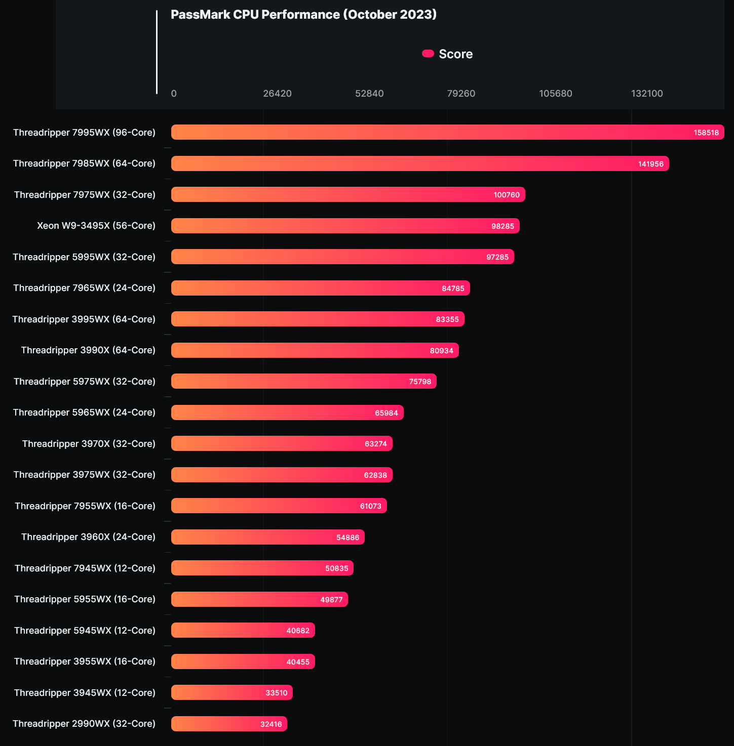 성능 점수부터 시작하여 먼저 96개의 코어와 158,518점의 기념비적인 점수를 갖춘 AMD Ryzen Threadripper PRO 7995WX CPU를 보유하여 Pass Mark CPU 데이터베이스 내에서 가장 빠른 칩입니다. 이 칩 다음에는 제품군 내에서 두 번째로 좋은 칩인 AMD Ryzen Threadripper PRO 7985WX가 64개의 코어와 141,956점의 점수를 제공합니다. 이는 동일한 양의 Zen 3 코어를 갖춘 Threadripper PRO 5995WX에 비해 46% 증가한 수치입니다. 7995WX는 이전 제품에 비해 50% 추가 코어를 통해 보완된 엄청난 63% 증가로 한 단계 더 발전했습니다.