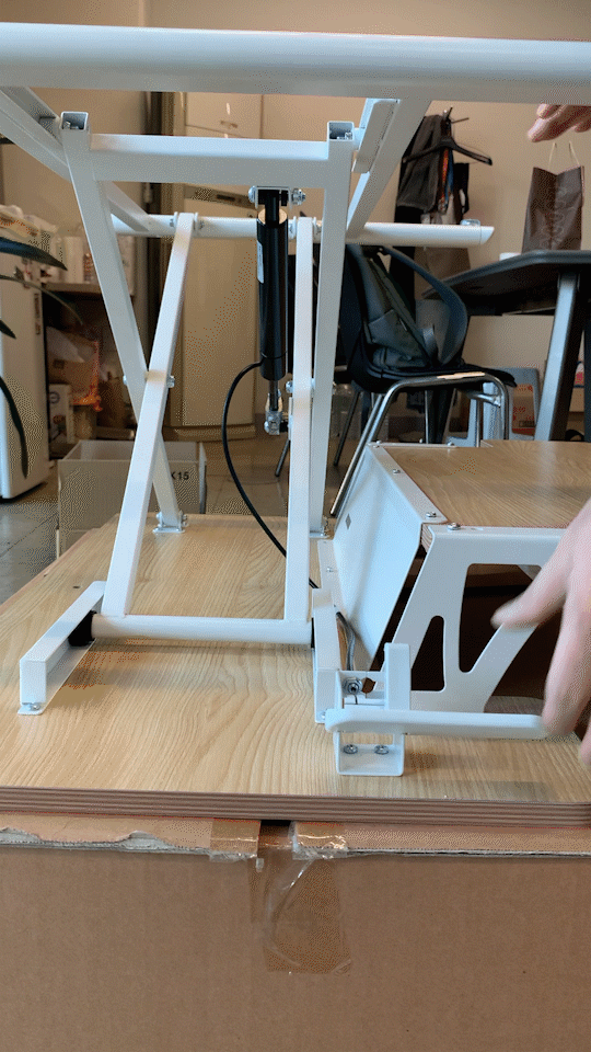 실사용시에는 모니터, 키보드, 마우스 등의 여러 주변 기기가 많기 때문에, 책상에 설치하기 전, 높이 조절 방법을 연습해 보았습니다. 한 손은 레버를 누르고, 다른 손은 튀어오를 정도로 장력을 억제하거나 높이를 조절하기 위해 사용했습니다.