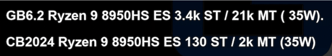 RedGamingTech은 또한 Ryzen 9 8950HS 엔지니어링 샘플에서 Geekbench 및 Cinebench 2024에 대한 몇 가지 수치를 제공했습니다. 이는 Strix Point 제품군의 35와트 Zen 5 모바일 프로세서로 알려져 있습니다. 그가 제시하는 벤치마크 가치는 매우 인상적입니다. Ryzen 9 7940HS 와 비교하면 단일 스레드에서 Geekbench 점수가 37%, 여러 스레드에서 무려 77% 증가한 것으로 나타났습니다. Cinebench 단일 스레드 수치는 약 24%로 약간 더 나쁘지만 멀티 스레드 점수는 7940HS가 수행할 수 있는 것보다 두 배 이상 높습니다.